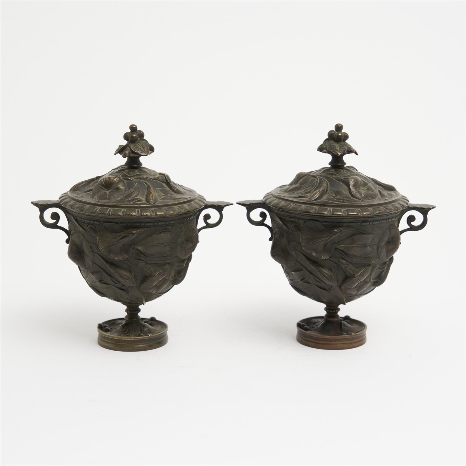 A PAIR OF FRENCH CAST BRONZE FLORAL LIDDED URNS H.17CM