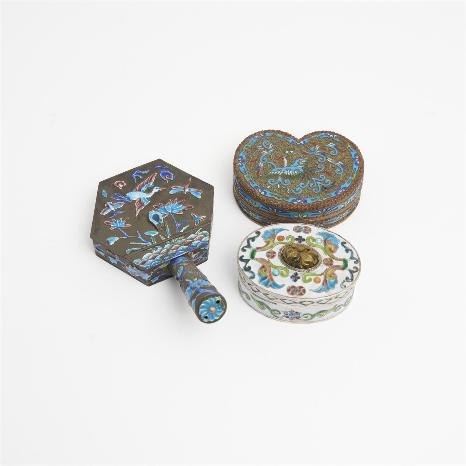A GROUP OF THREE EARLY 20TH CENTURY CHINESE SILVER BRASS AND ENAMEL BIRD DECORATED LID BOXES, ONE WITH CARVED TIGER EYE SET TO LID L.14CM (LARGEST)