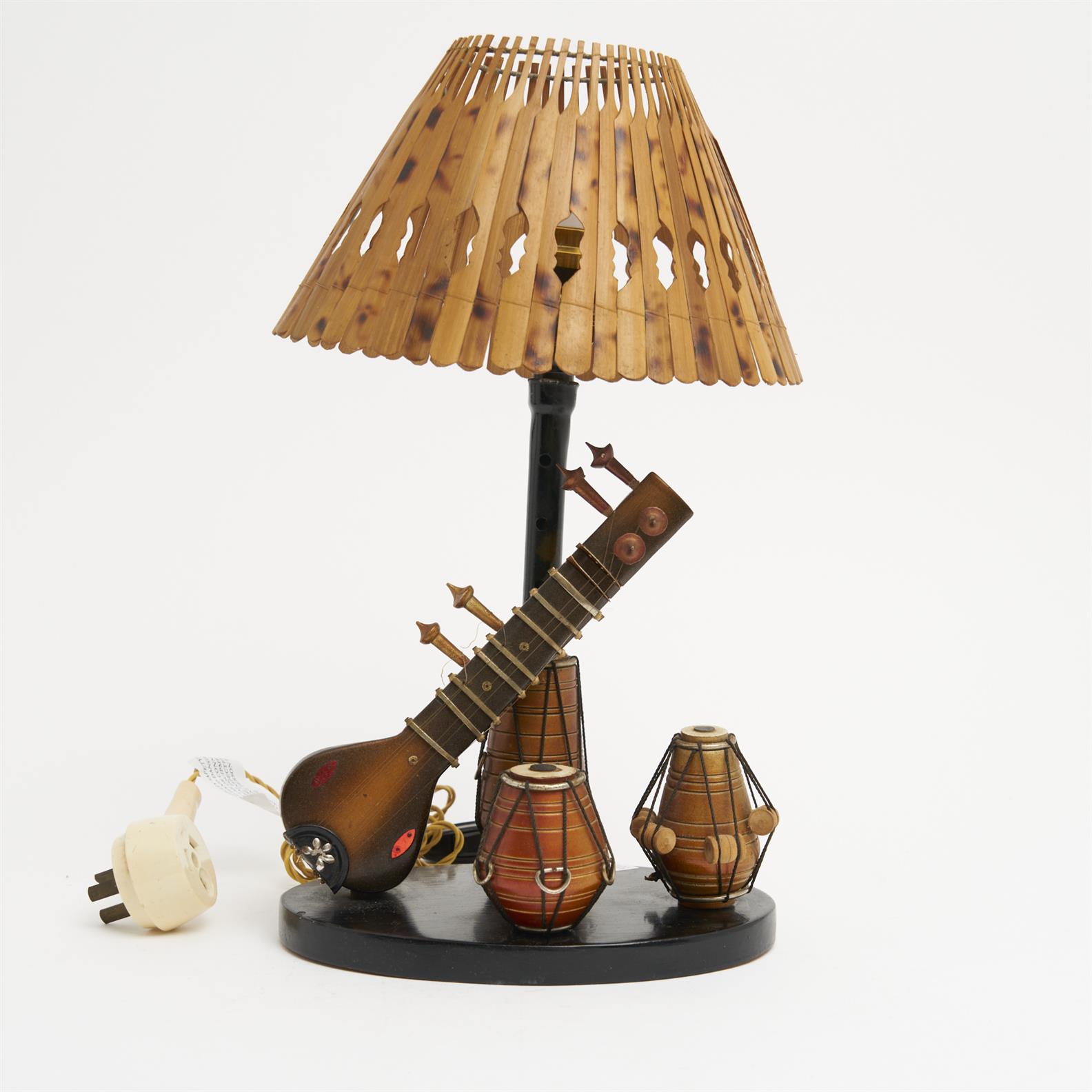 A VINTAGE CARVED WOODEN TIKI BAR LAMP WITH ORIGINAL TORTOISESHELL BAMBOO SHADE H.38CM