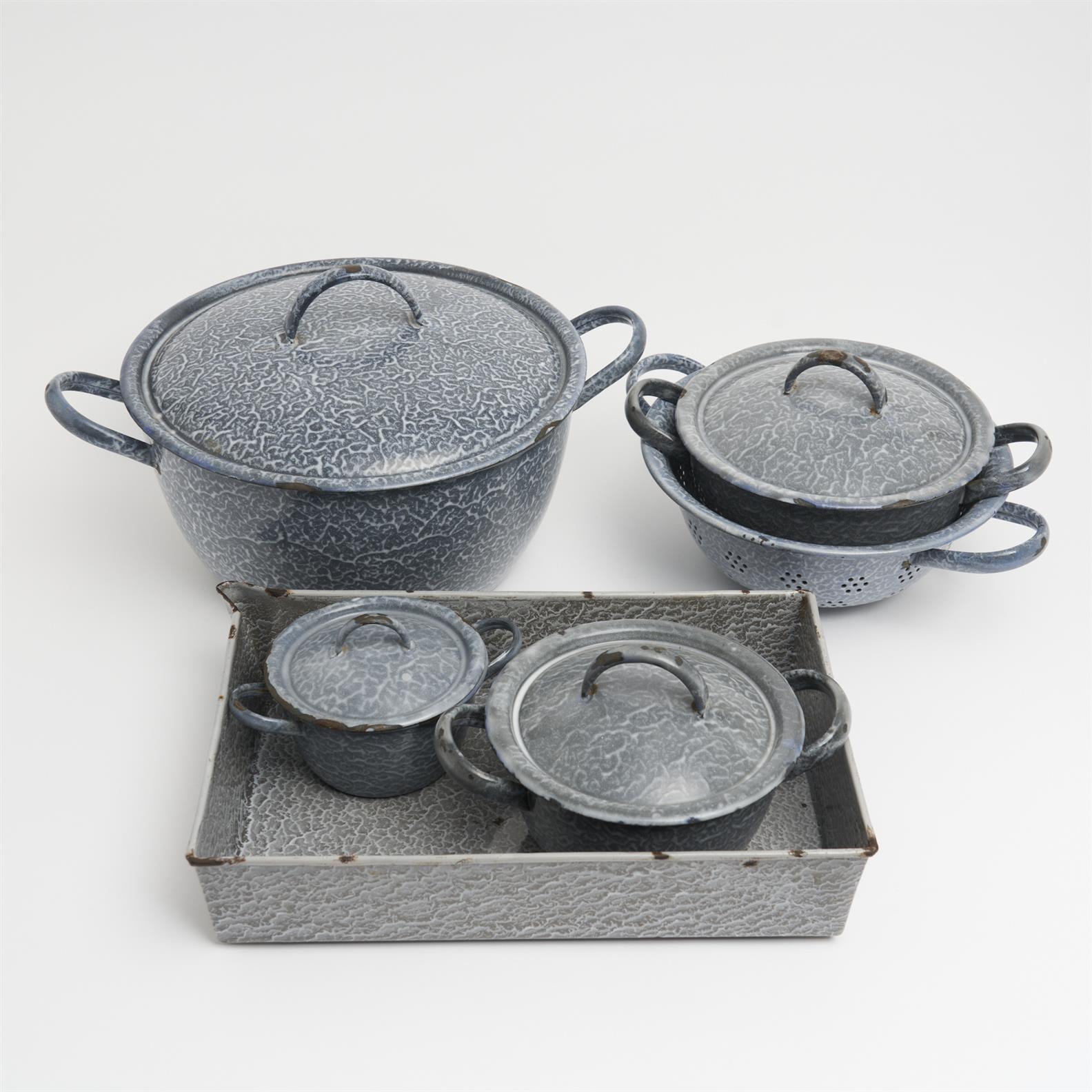 A LARGE COLLECTION OF AUSTRALIAN GREY CLOUD ENAMEL KITCHEN WARE INCLUDING FOUR LIDDED POTS, A COLANDER AND DRIP TRAY L.36CM (LONGEST)
