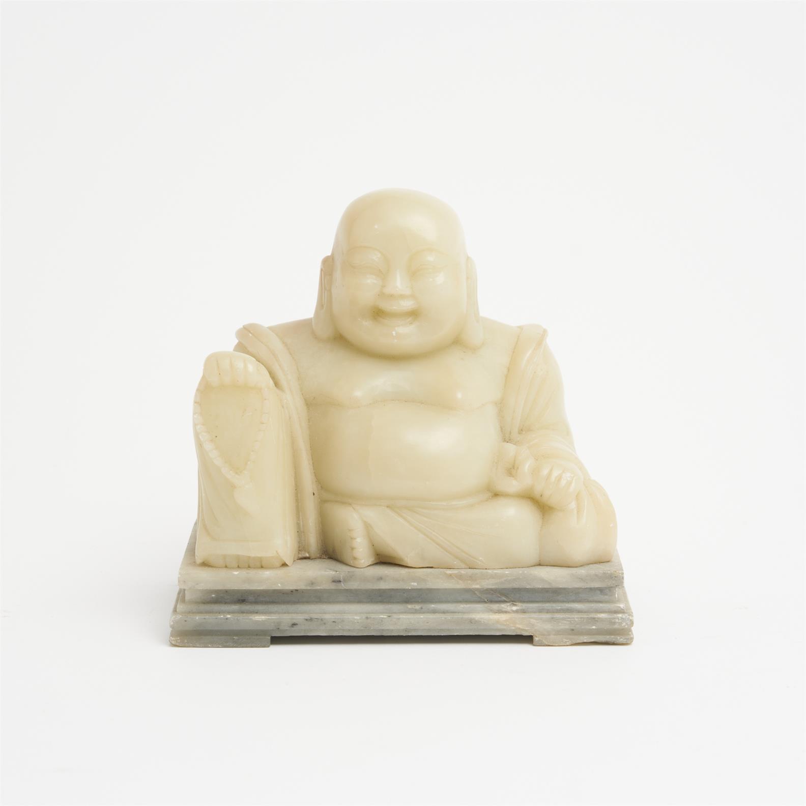 A HEAVY CHINESE CARVED SOAP STONE BUDDHA FIGURE W.18CM