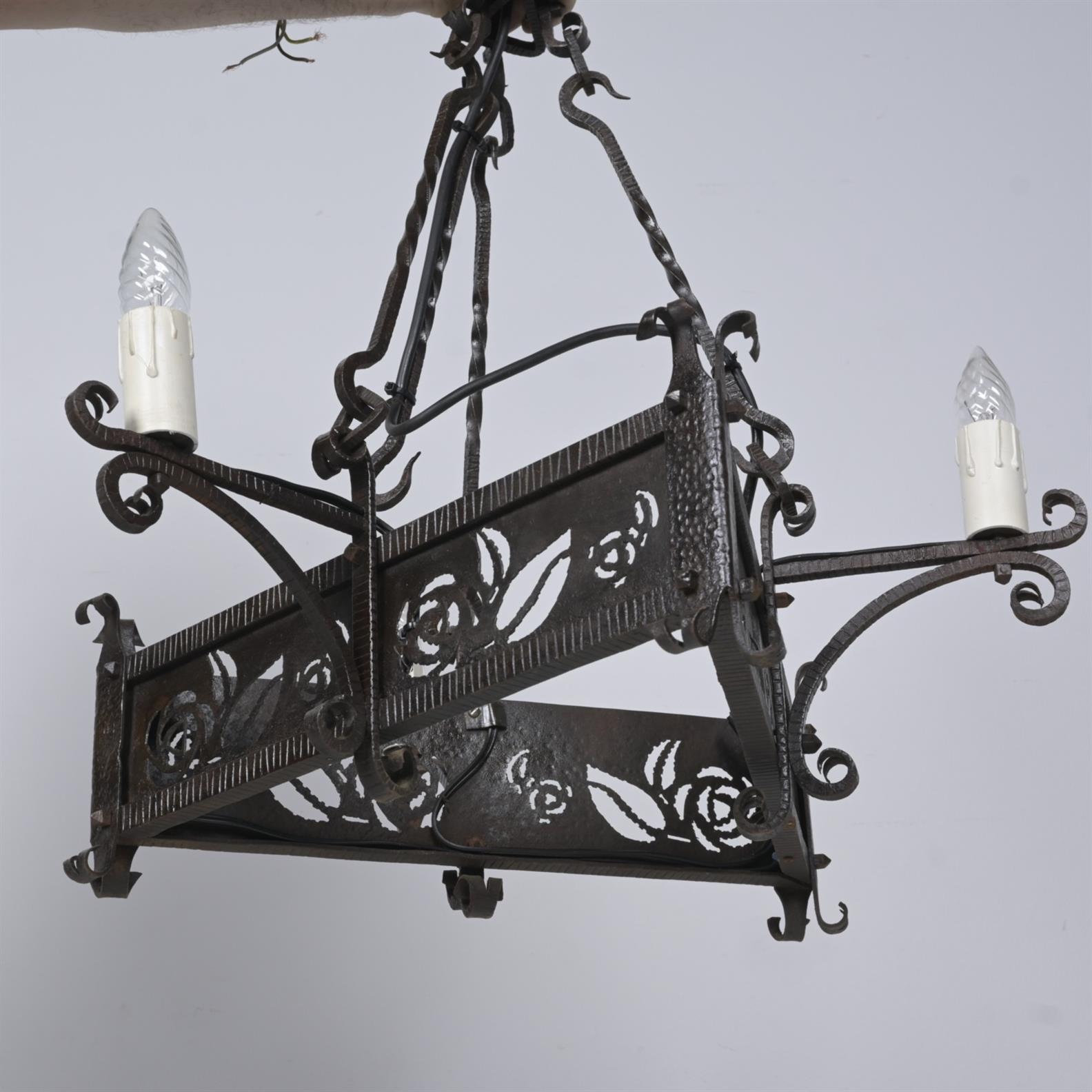 AN EARLY 1900'S WROUGHT IRON GOTHIC THREE CANDLE CHANDELIER (45H X 50D CM)