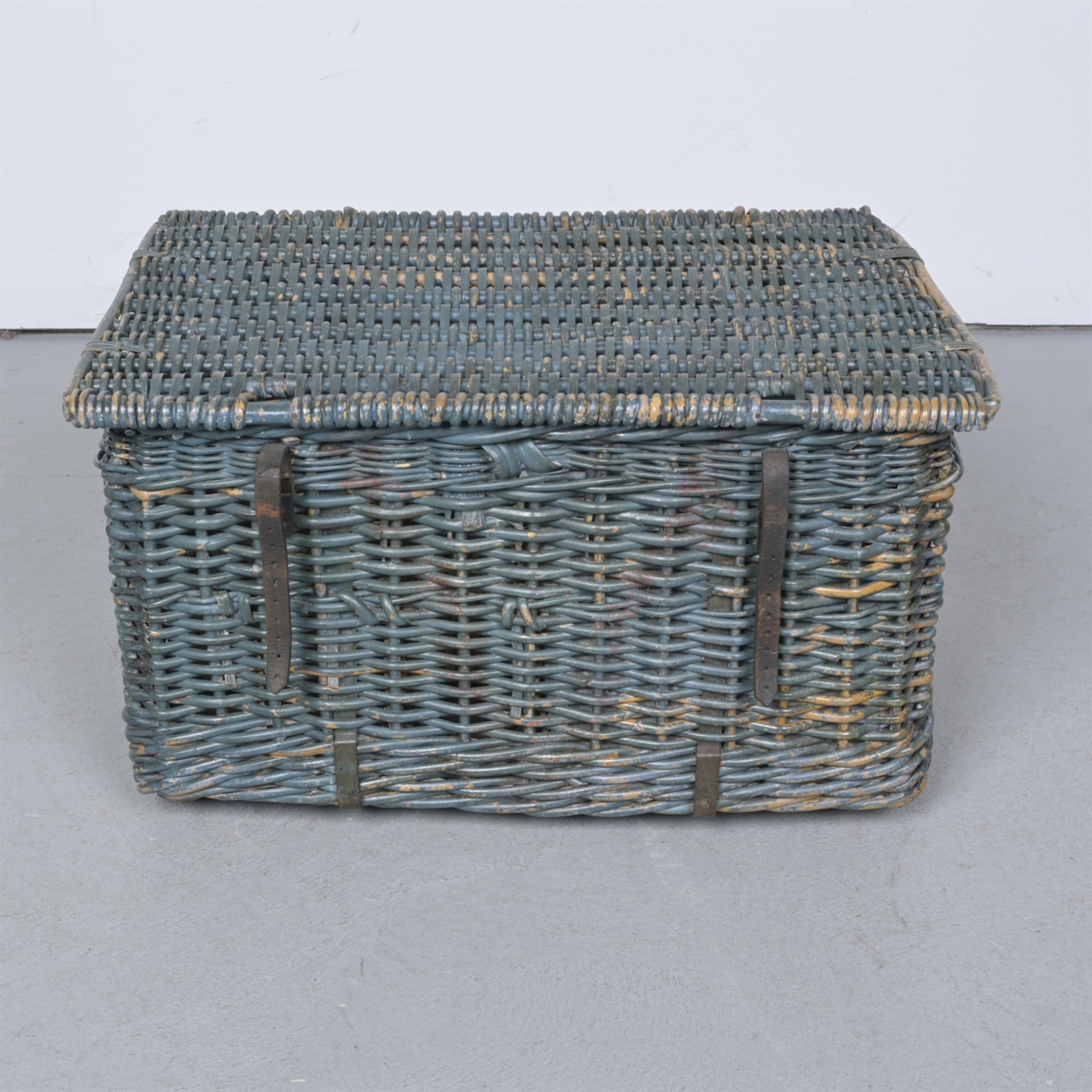 AN EARLY 20TH CENTURY PAINTED WOVEN CANE TRAVELLING BOX (A/F 41H X 70W X 51D CM)