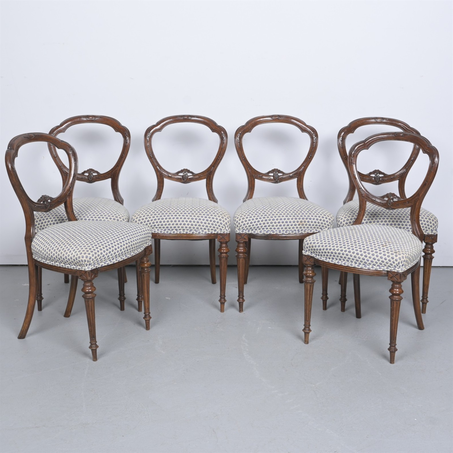 A SET OF SIX VICTORIAN ENGLISH MAHOGANY BALLOON BACK DINING CHAIRS (77H X 48W X 45D CM)