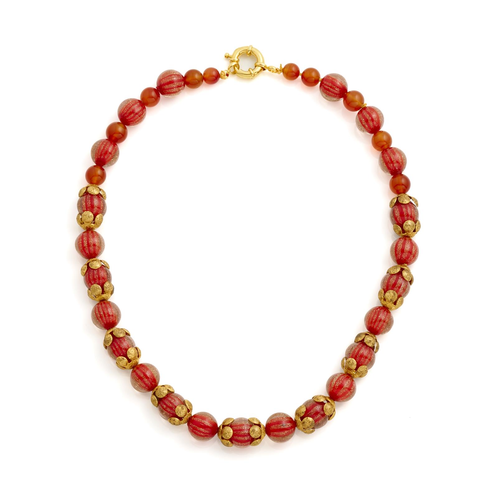 A STRAND OF MURANO BEADS TO A BOLT CLASP IN SILVER GILT WITH SILVER SPACERS, 480MM