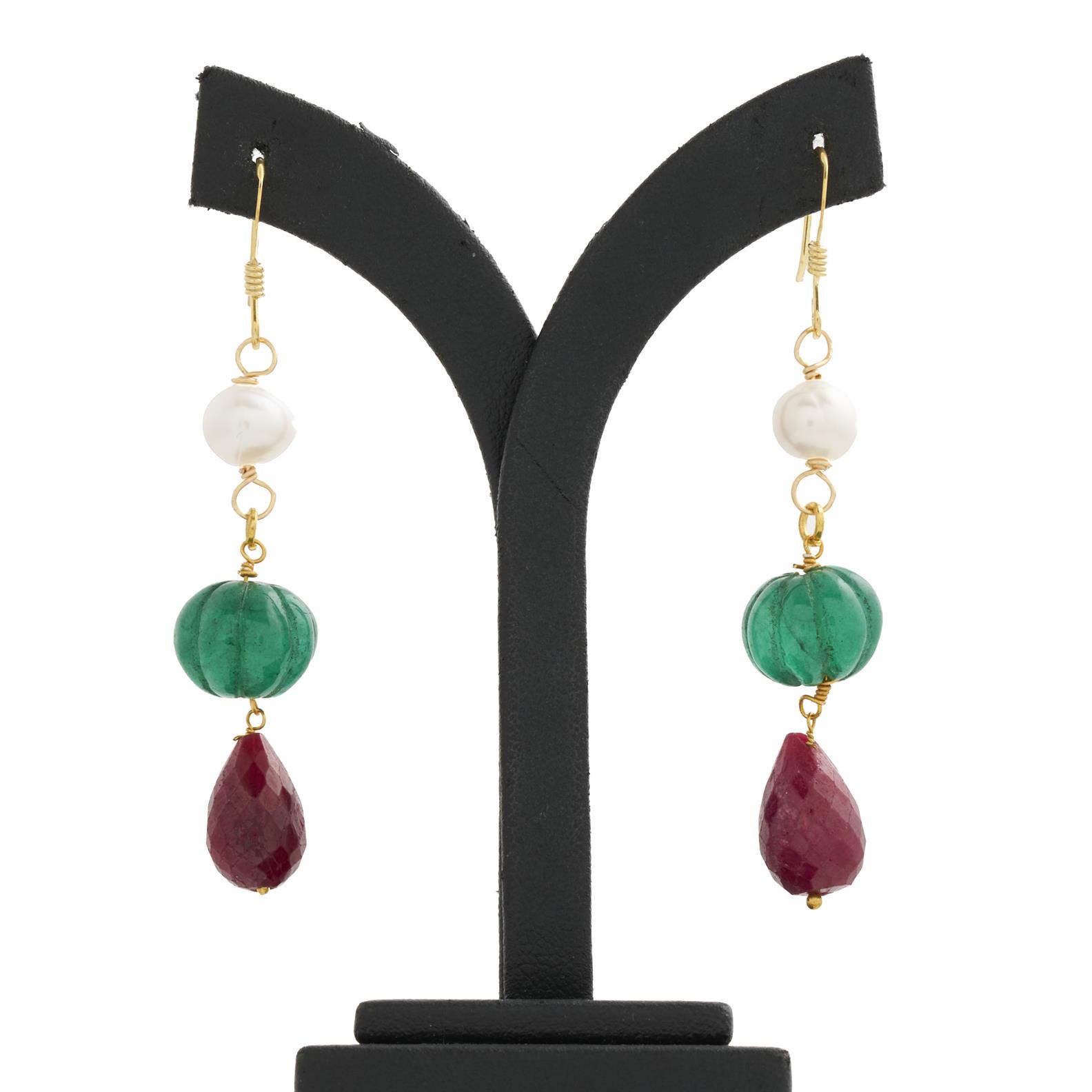 A PAIR OF CARVED EMERALD, RUBY AND PEARL EARRINGS IN SILVER GILT, TO SHEPHERD HOOK FITTINGS, 50MM
