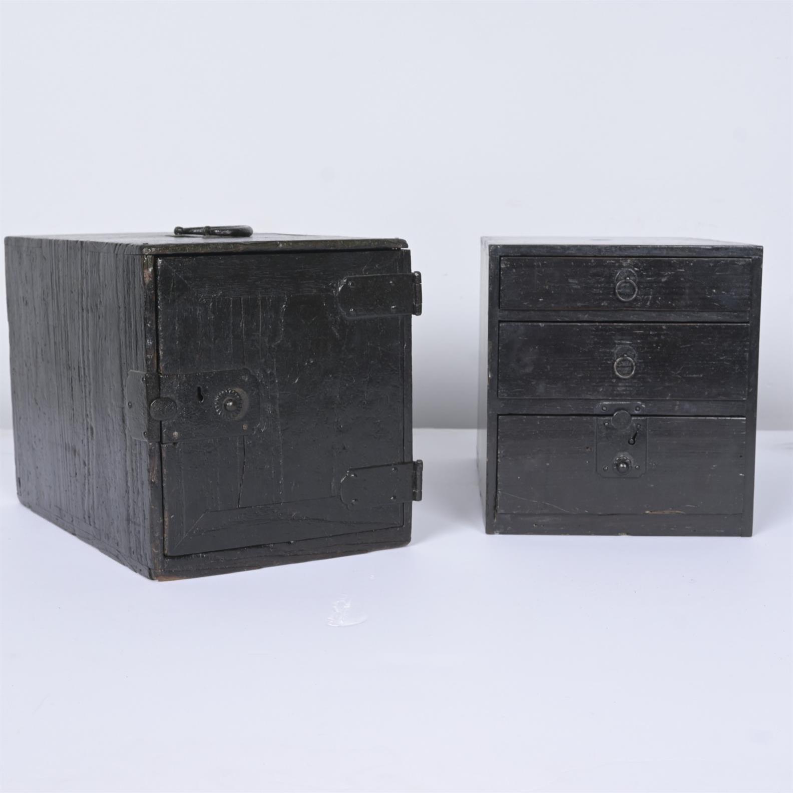 TWO MEIJI PERIOD CALLIGRAPHY BOXES, ONE IN KIRI WOOD AND ONE IN SUGI WOOD (LARGEST MEASURES 21H X 20W X 34D CM)