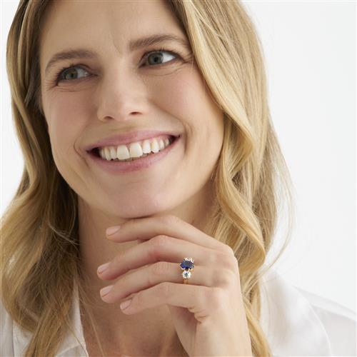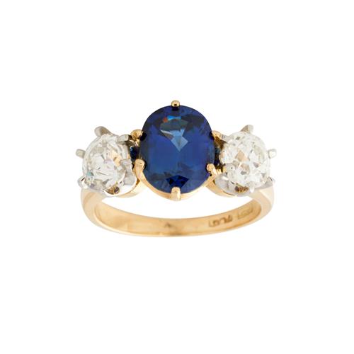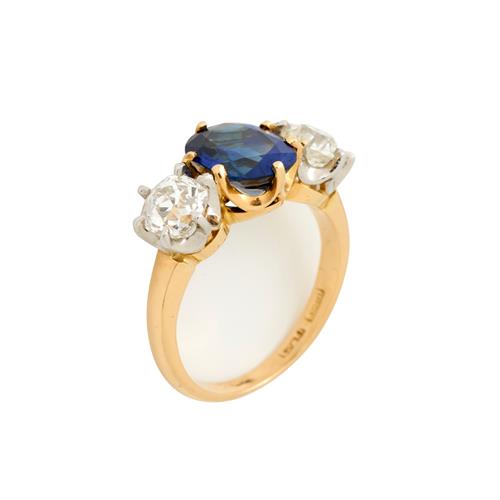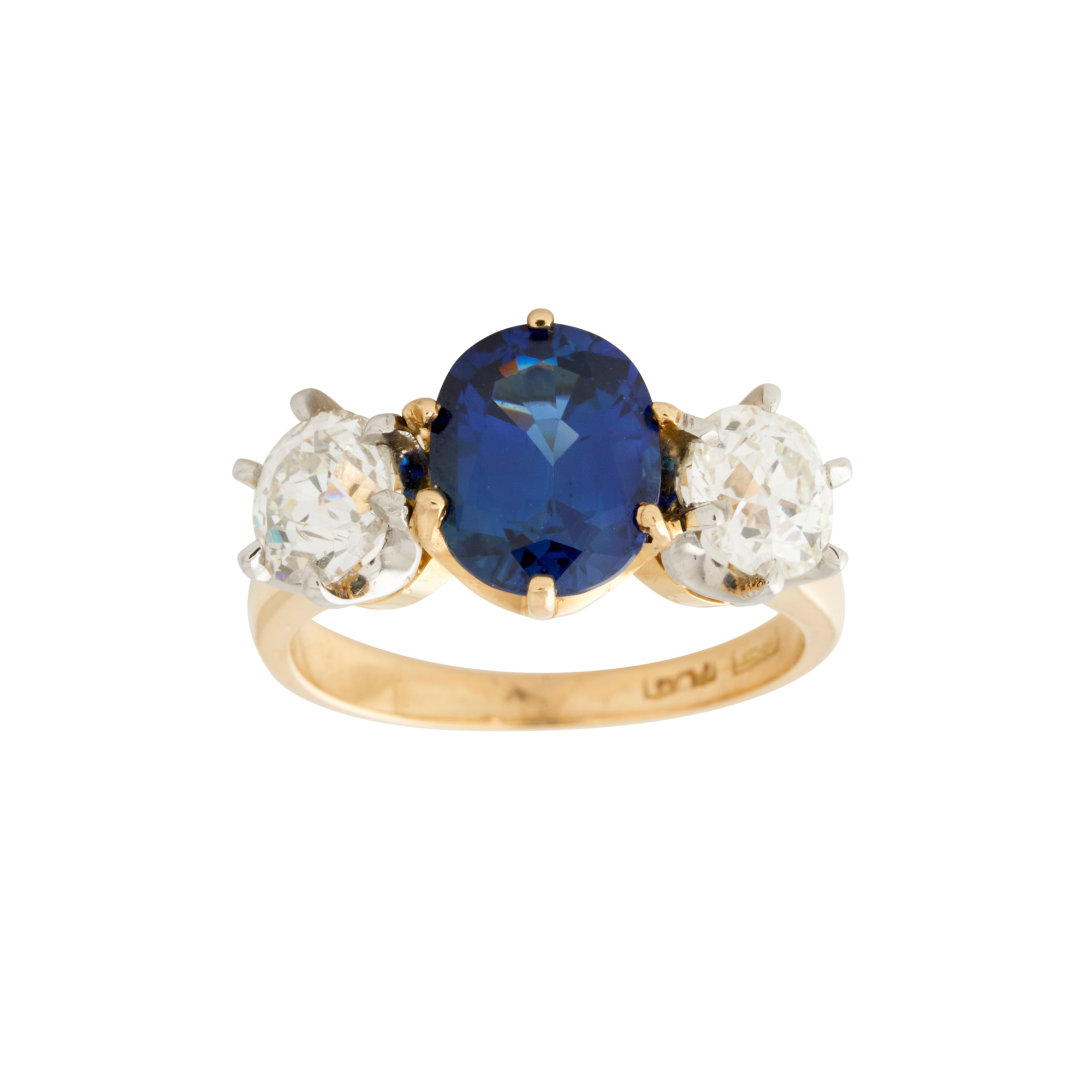 Centring a claw-set oval-cut sapphire weighing 1.76 carats, flanked by two claw-set round brilliant-cut diamonds together weighing 1.68 carats, size L, gross weight approximately 5.00 grams