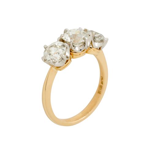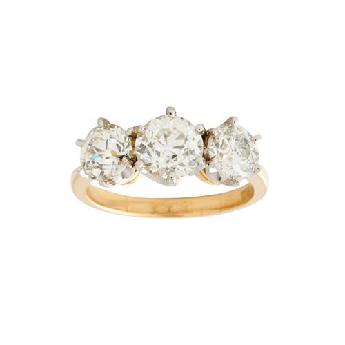 Centring a claw-set old European-cut diamond weighing 1.52 carats, flanked by two further old European-cut diamonds together weighing approximately 2.12 carats, size P, gross weight approximately 5.4 grams.