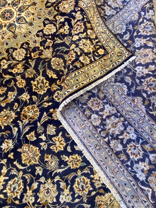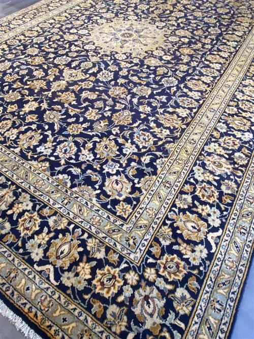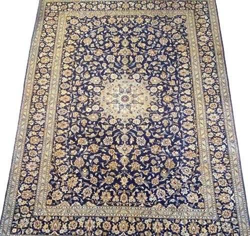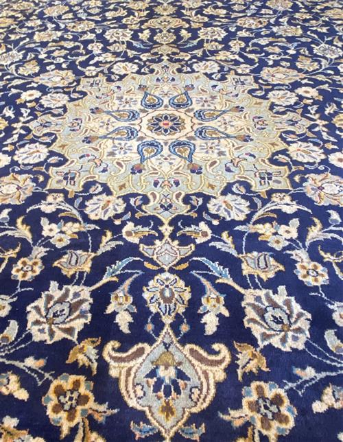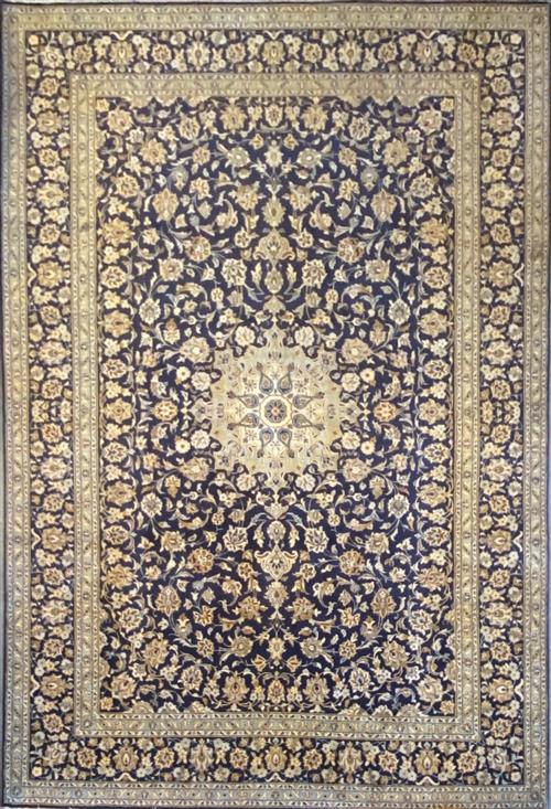 WOOLLEN PILE. HAND-KNOTTED CITY WEAVE FROM NORTH ISFAHAN PROVINCE WITH CLASSIC KASHAN BOOK COVER DESIGN OF A SUNBURST MEDALLION IN A ROYAL PERSIAN BLUE FIELD OF SHAH ABBASSI PALMETTES, FLORAL SPRAYS, FLOWER HEADS AND SAZ LEAVES IN SHADES OF CREAM, CORNFLOWER BLUE & SAFFRON. MAJOR BORDER OF PALMETTES & SAZ LEAVES.