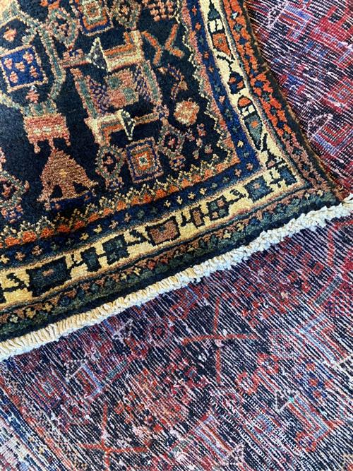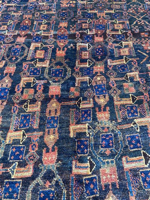 DENSE WOOL PILE & VEGETABLE DYES AND NATURAL ABRASH. HAND-KNOTTED VILLAGE WEAVE FROM THE KURDISTAN REGION WITH AN ALL-OVER BOLD HERATI MAHI DESIGN. BORDER OF PAISLEY MOTIFS. THE ENTIRE IN SHADES OF INDIGO, TERRACOTTA & CREAM.