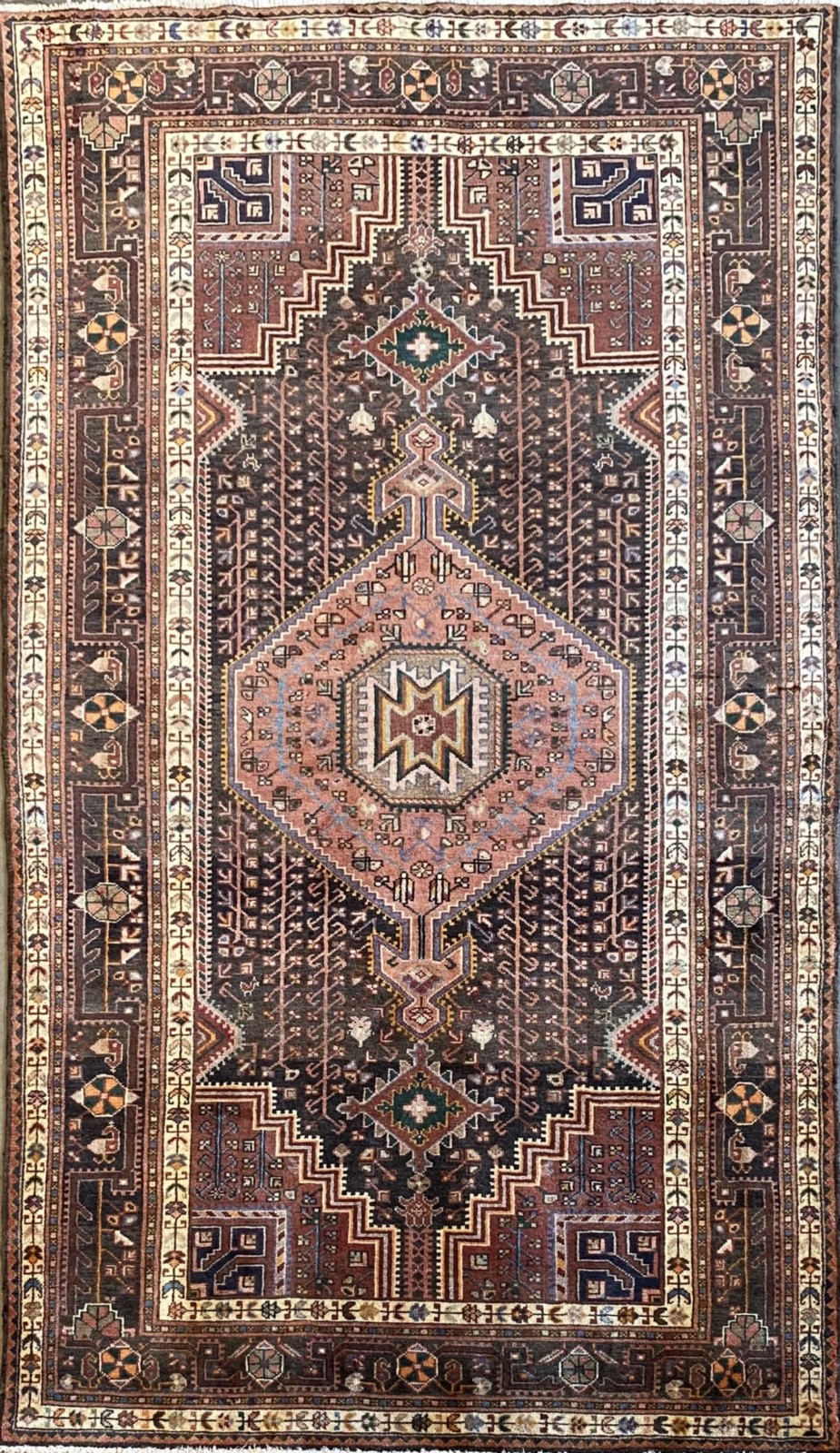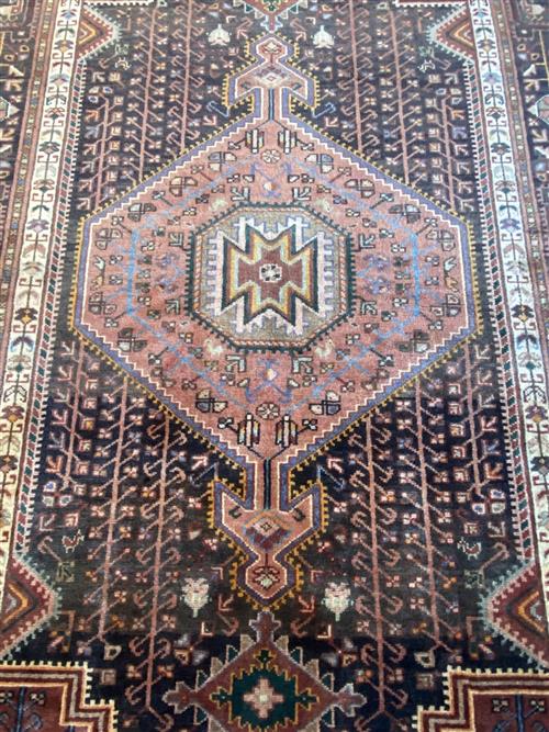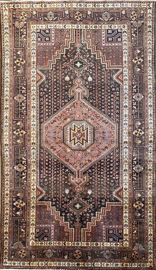 WOOL & VEGETABLE DYES. HAND-KNOTTED VILLAGE WEAVE FROM THE HAMADAN REGION WITH A DISTINCT DESIGN OF CENTRAL HEXAGONAL ANCHORED MEDALLION CONTAINING A TRIBAL AMULET IN A CHARCOAL FIELD OF MULTIPLE ROWS OF TREE OF LIFE PATTERNS. BORDER OF ROSETTES.