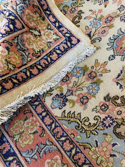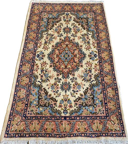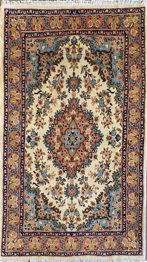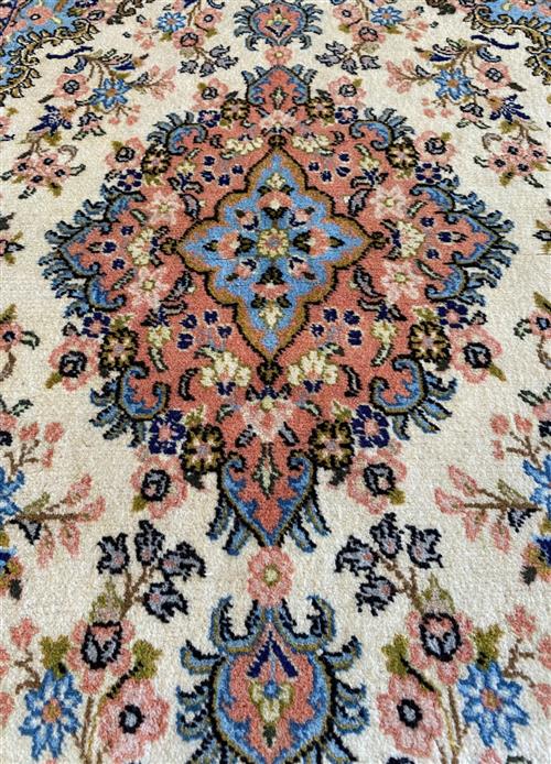 LAMB'S WOOL PILE. HAND-KNOTTED KURDISH WEAVE WITH CLASSIC PERSIAN FLORAL DESIGN OF ELONGATED FLORAL MEDALLION AND QUARTERED CORNER MEDALLIONS IN A FIELD OF FLORAL SPRAYS. THE ENTIRE IN SHADES OF CREAM, ROSE & FRENCH BLUE.