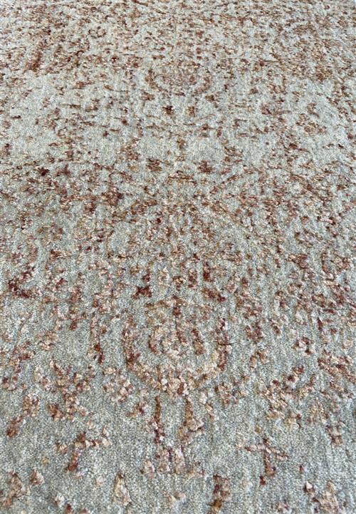 HAND-WOVEN LOOM KNOT. WOOL & SILK TEXTURE PILE. TRANSITIONAL DESIGN OF ALL-OVER ERASED & EMBOSSED PALMETTES & FLORAL PATTERNS IN SHADES OF SILVER & COPPER.