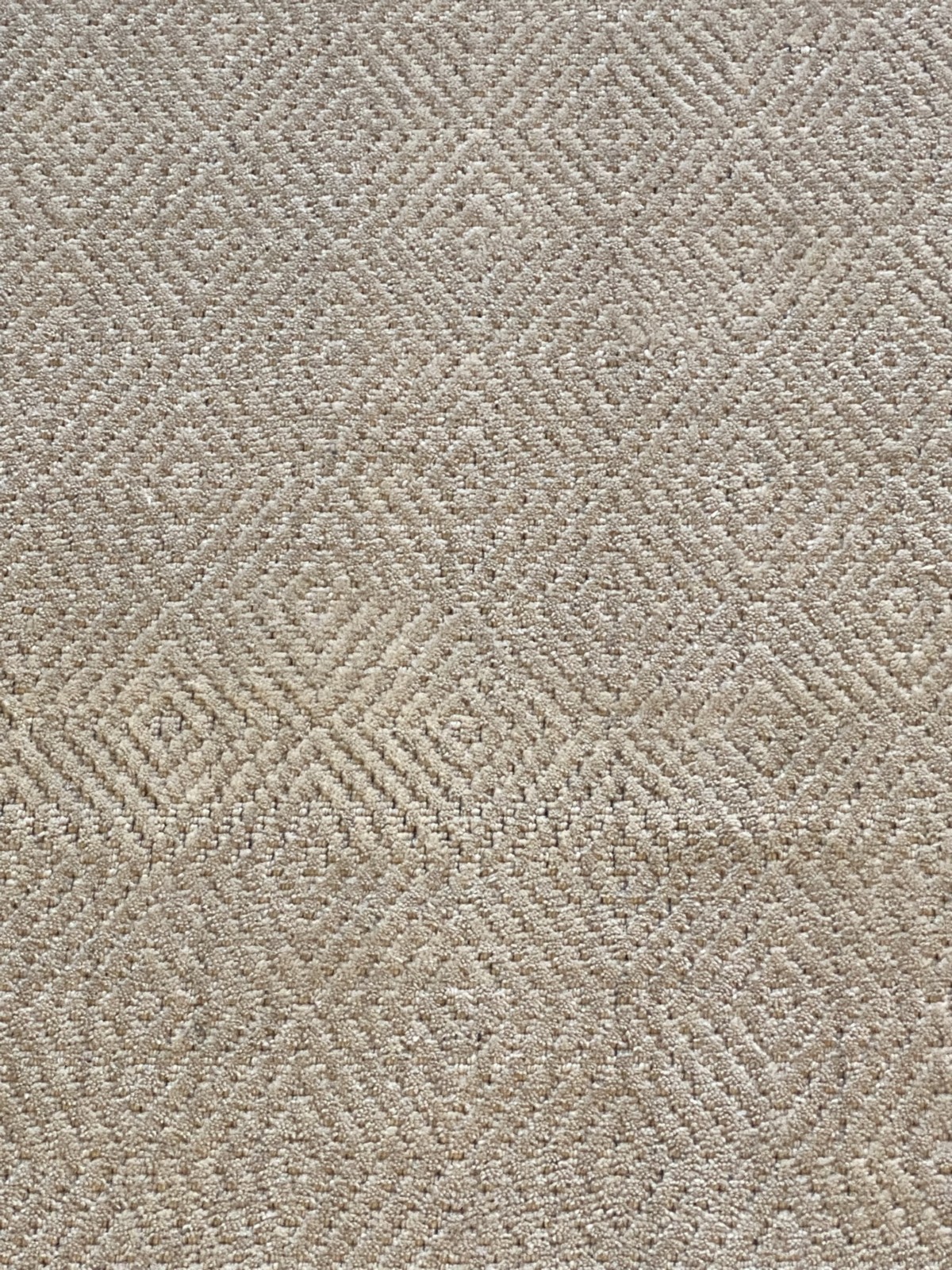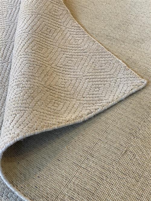 HANDMADE LOOM KNOT. MODERN DESIGN OF ALL-0VER INTER-LOCKING &EMBOSSED DIAMOND-SHAPED PATTERNS IN BEIGE.