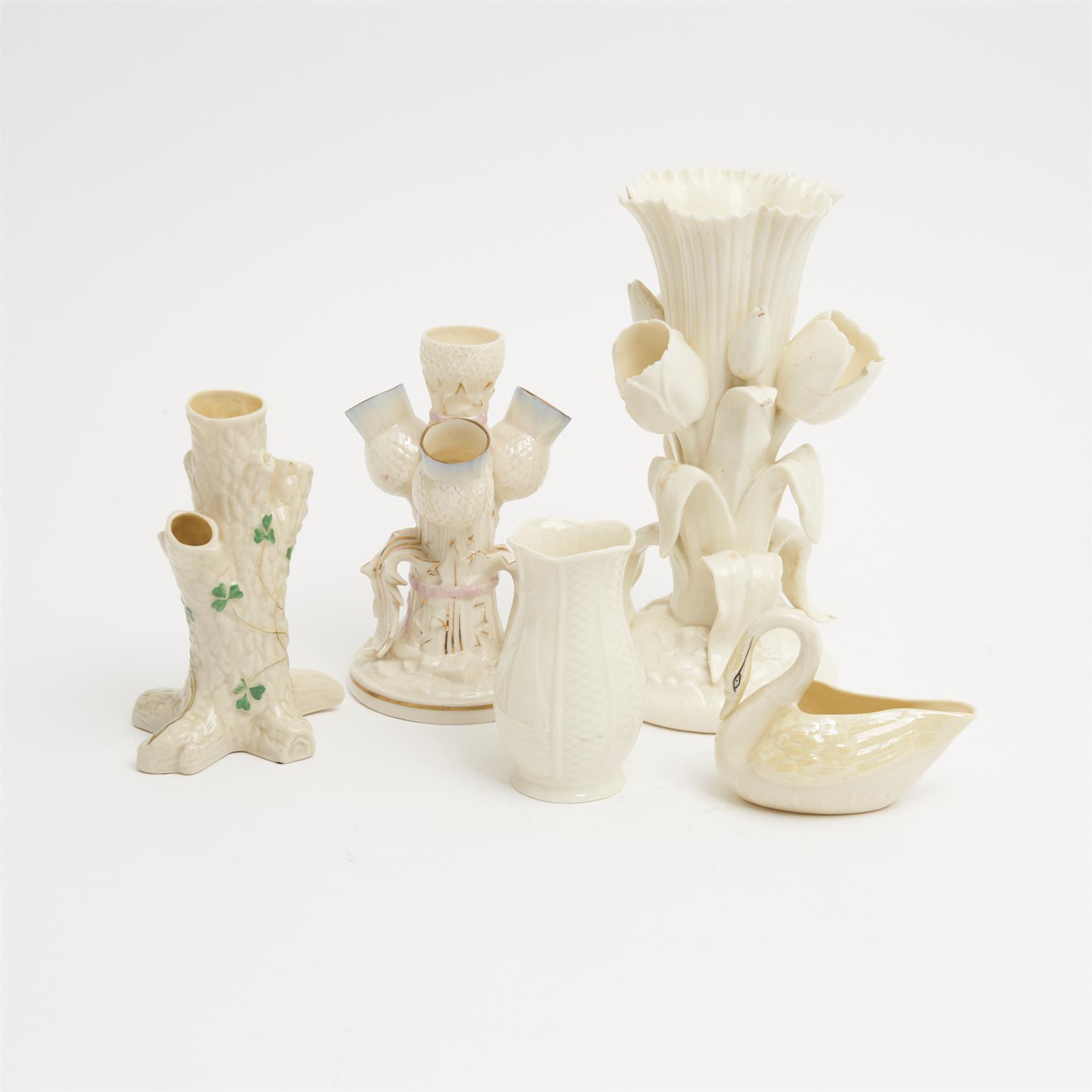 FIVE BELLEEK VASES INCLUDING TWO BEARING THE BLACK MARK (A/F) H.23.5CM