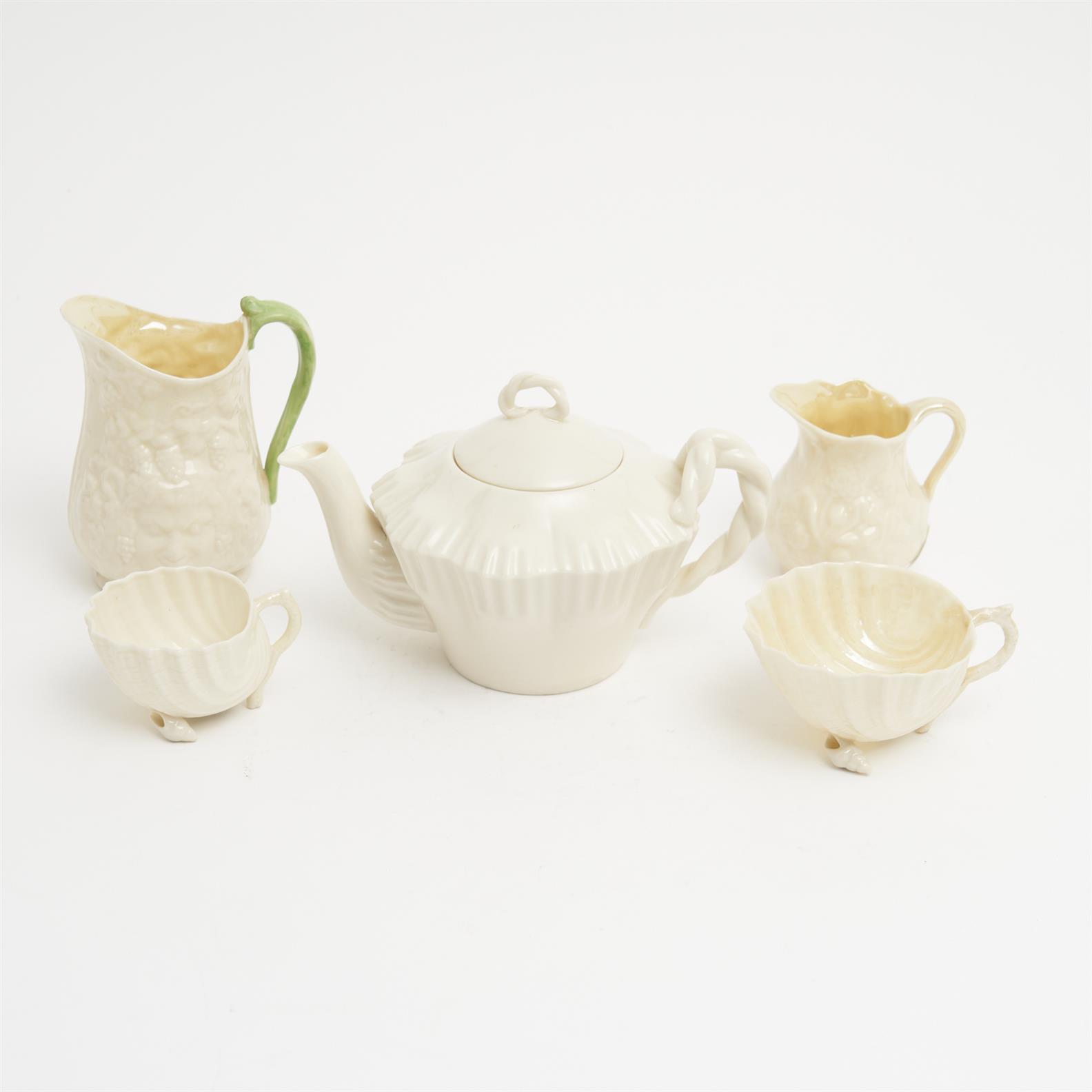 FIVE PIECES IF BELLEEK BLACK MARK PORCELAIN INCLUDING A TEAPOT, TWO JUGS AND TWO SHELL FORM TEACUPS (A/F) W.18.5CM (TEAPOT)