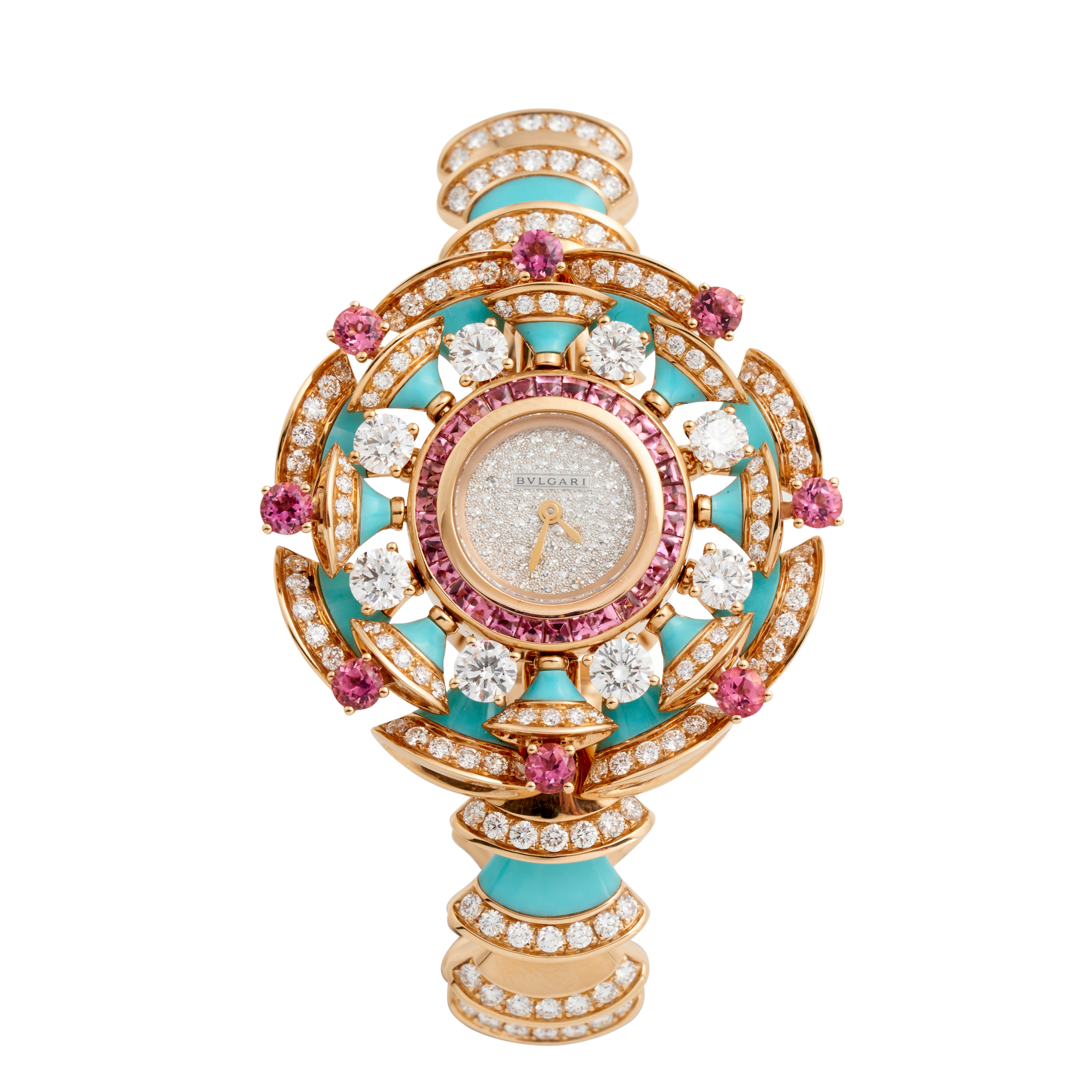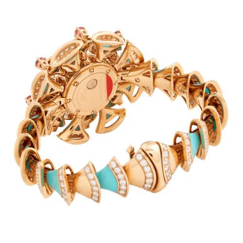 BULGARI, 18CT ROSE GOLD, DIAMOND, TURQUOISE AND TOURMALINE 'DIVA' BRACELET WATCH