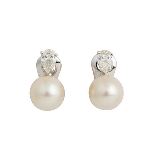From the 'Millenia' Collection, each earring composed of a round pearl of cream hues measuring approximately 9.20mm, to a claw-set pear-cut diamond surmount, the diamonds together weighing approximately 0.60 carats, signed Bvlgari, to post and clip fittings, gross weight approximately 7.30 grams.