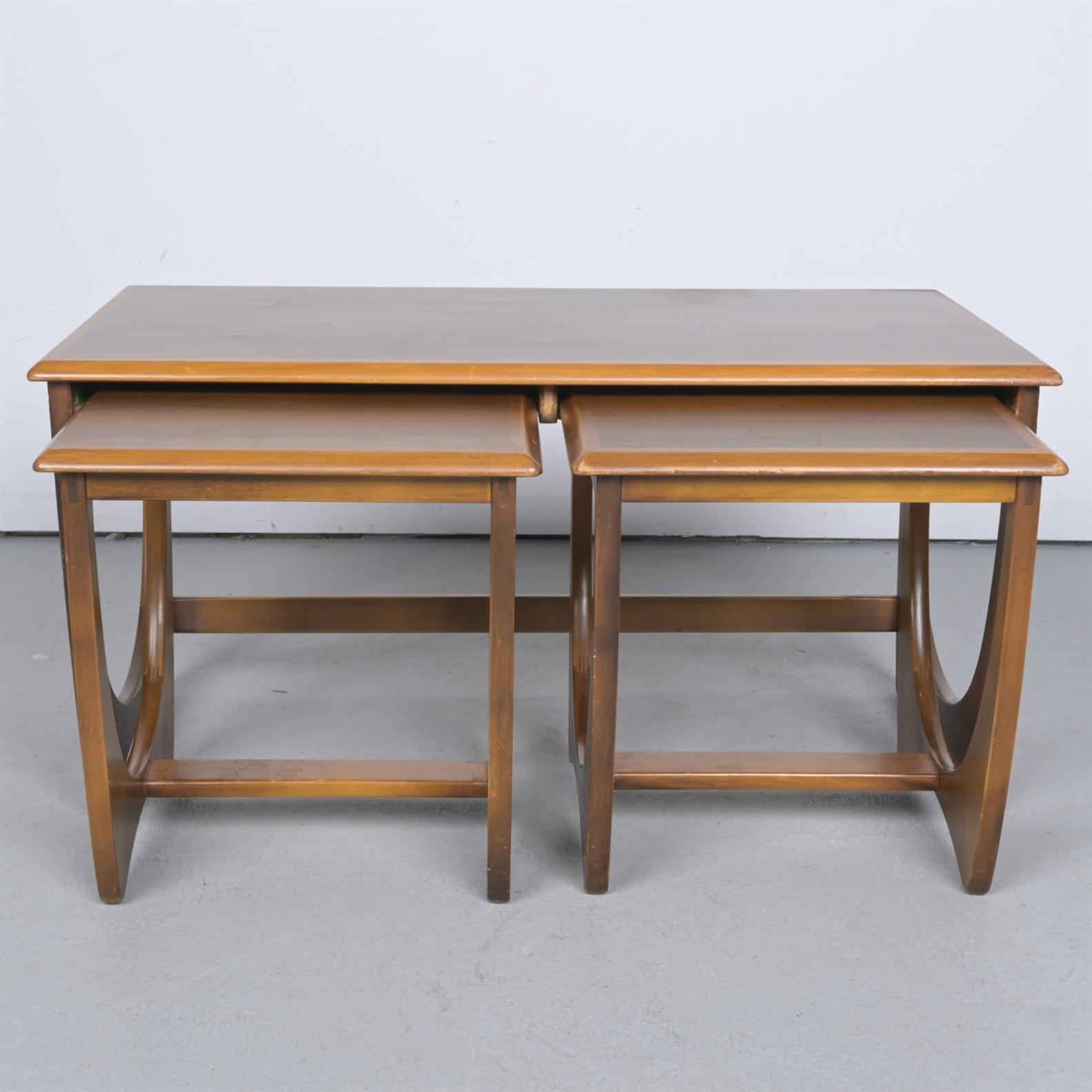 A MID-20th CENTURY WALNUT NESTING COFFEE TABLE SET BY KALMAR, AUSTRALIA (46H X 94W X 51D CM)