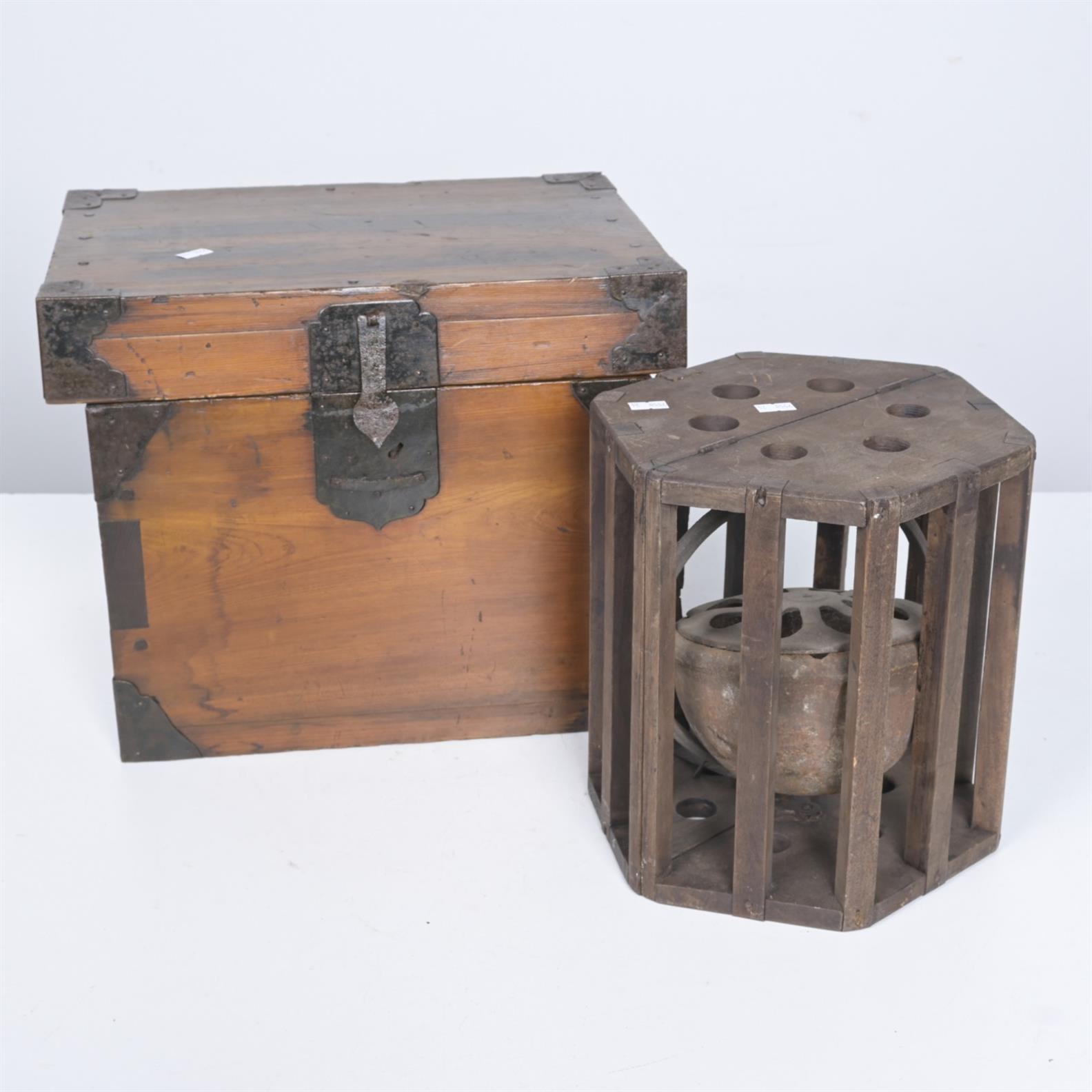 AN EARLY 20TH CENTURY SMALL JAPANESE KOTATSU WITH A MEIJI PERIOD JAPANESE SUGI WOOD CASH BOX (CASH BOX MEASURES 31H X 38W X 28D CM)