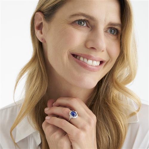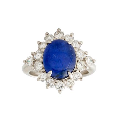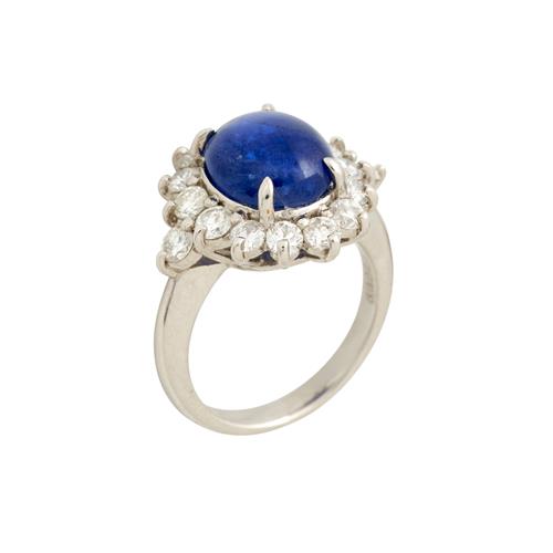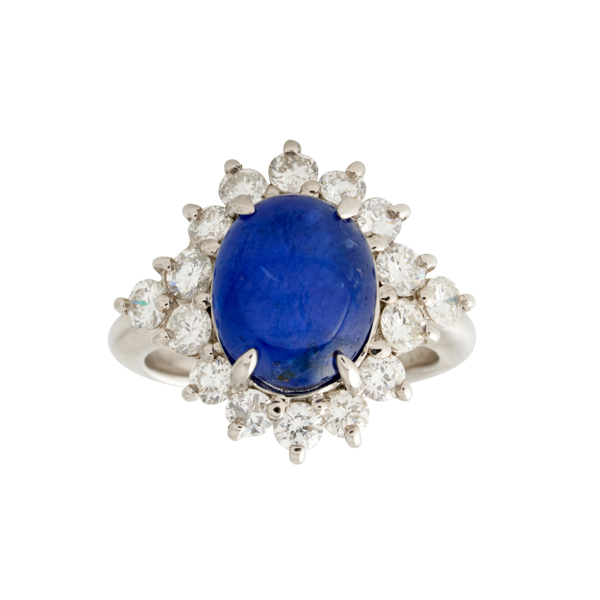 Of cluster design, centring a claw-set oval cabochon sapphire weighing approximately 6.80 carats, within a surround of claw-set round brilliant-cut diamonds together weighing approximately 1.30 carats, size K 1/2 , gross weight approximately 10.0 grams.