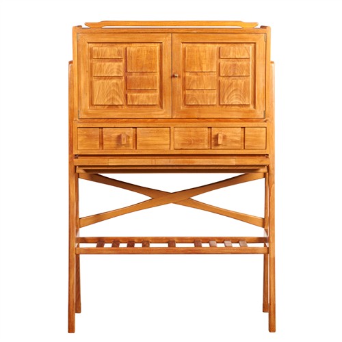 Rectangular, the top with a low rail to the back above a pair of doors enclosing an adjustable glass shelf against the mirrored back, a pair of drawers and a ceramic tile-lined slide below, all raised on a stand of A-frame supports to the sides joined with crossed stretchers to the back and a slatted under-tier, the door and drawer fronts geometrically moulded in panels