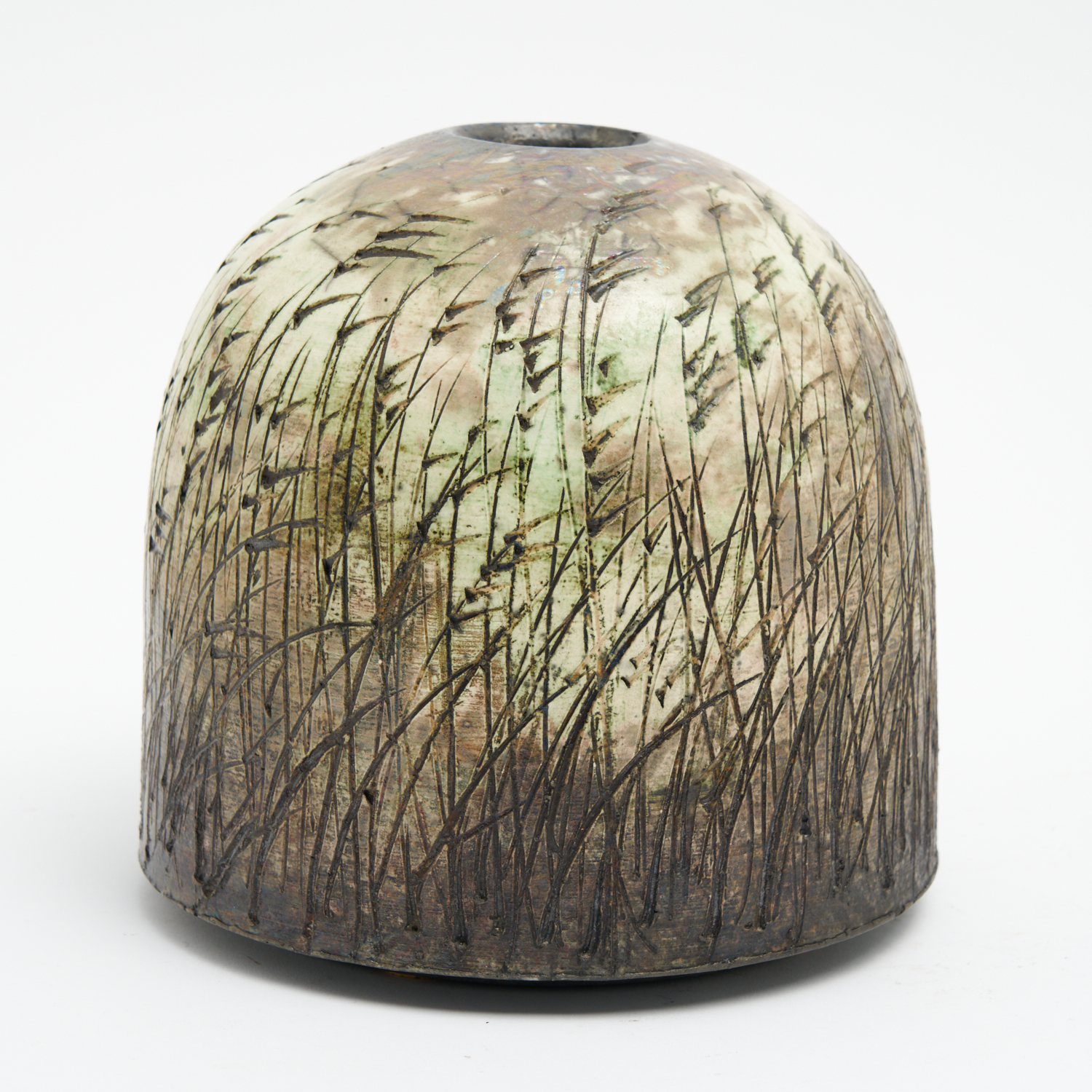 JEFF MINCHAM (1950 - ), A HIGH FIRED RAKU CERAMIC POT DEPICTING REEDS, SIGNED IN MONOGRAM ‘M90' TO UNDERSIDE, H.19CM