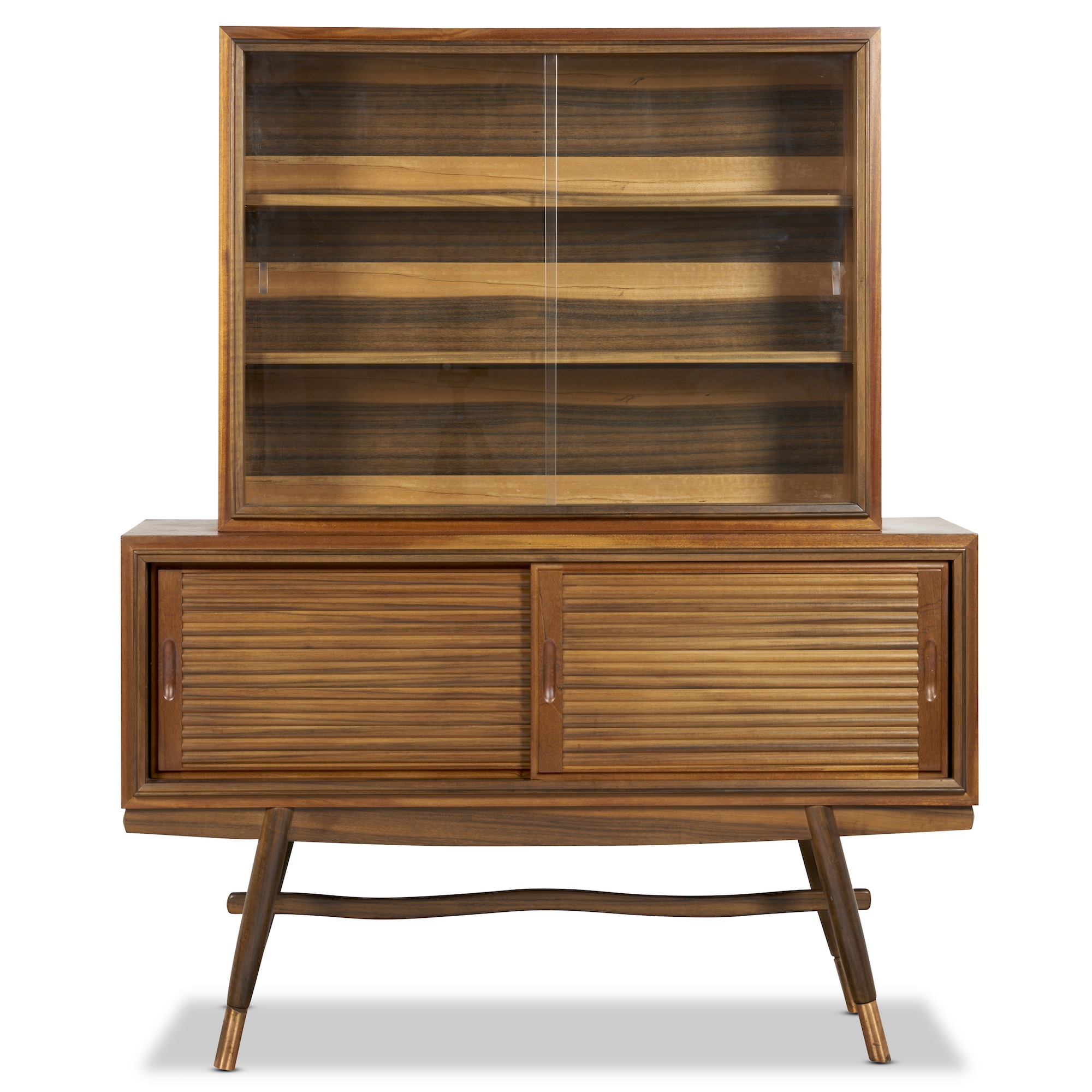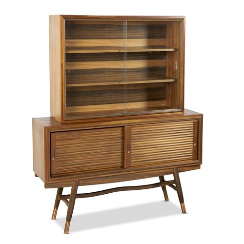 The recessed upper part with a pair of sliding glass doors enclosing adjustable shelves, the lower part with a pair of sliding horizontally-reeded doors enclosing an open interior, on splayed trestle supports with copper caps joined with a shaped stretcher