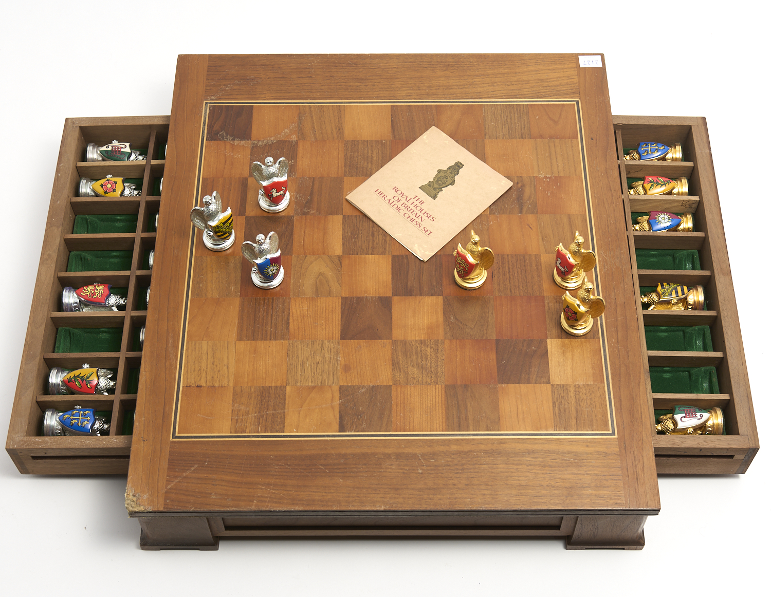 A 1982 FRANKLIN MINT ROYAL HOUSES BRITAIN HERALDIC CHESS SET WITH DOCUMENTS (A/F) 56 X 49CM
