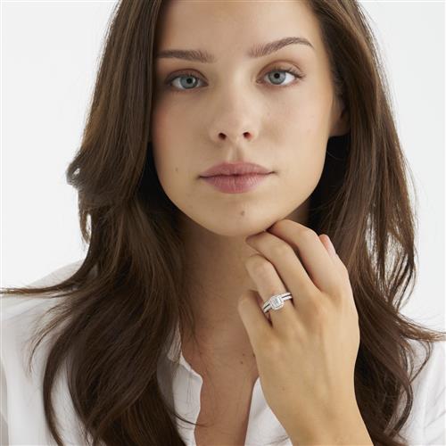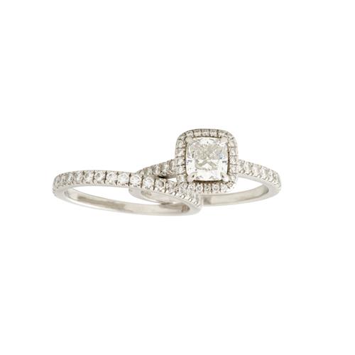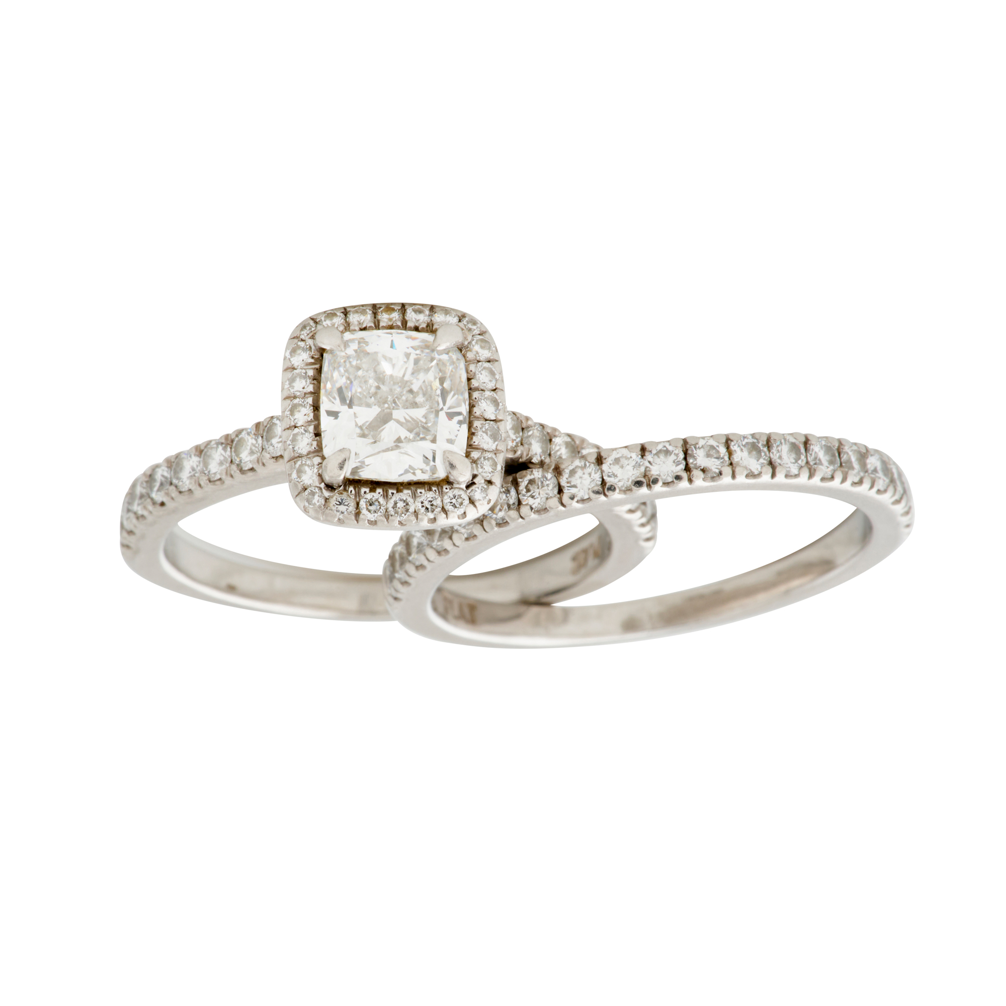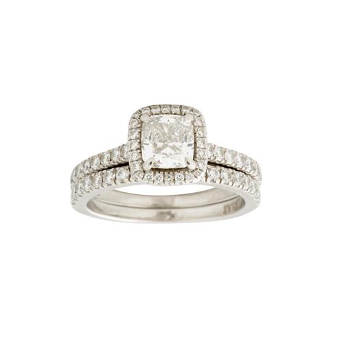 Of cluster design centring a cushion cut diamond of 1.31 carats within a surround of micro claw-set brilliant cut diamonds to diamond set shoulders, the diamonds together weighing approximately 0.25 carats; together with a band micro claw-set with round brilliant-cut diamonds together weighing approximately 0.38 carats, size P½, gross weight approximately 9.8 grams.