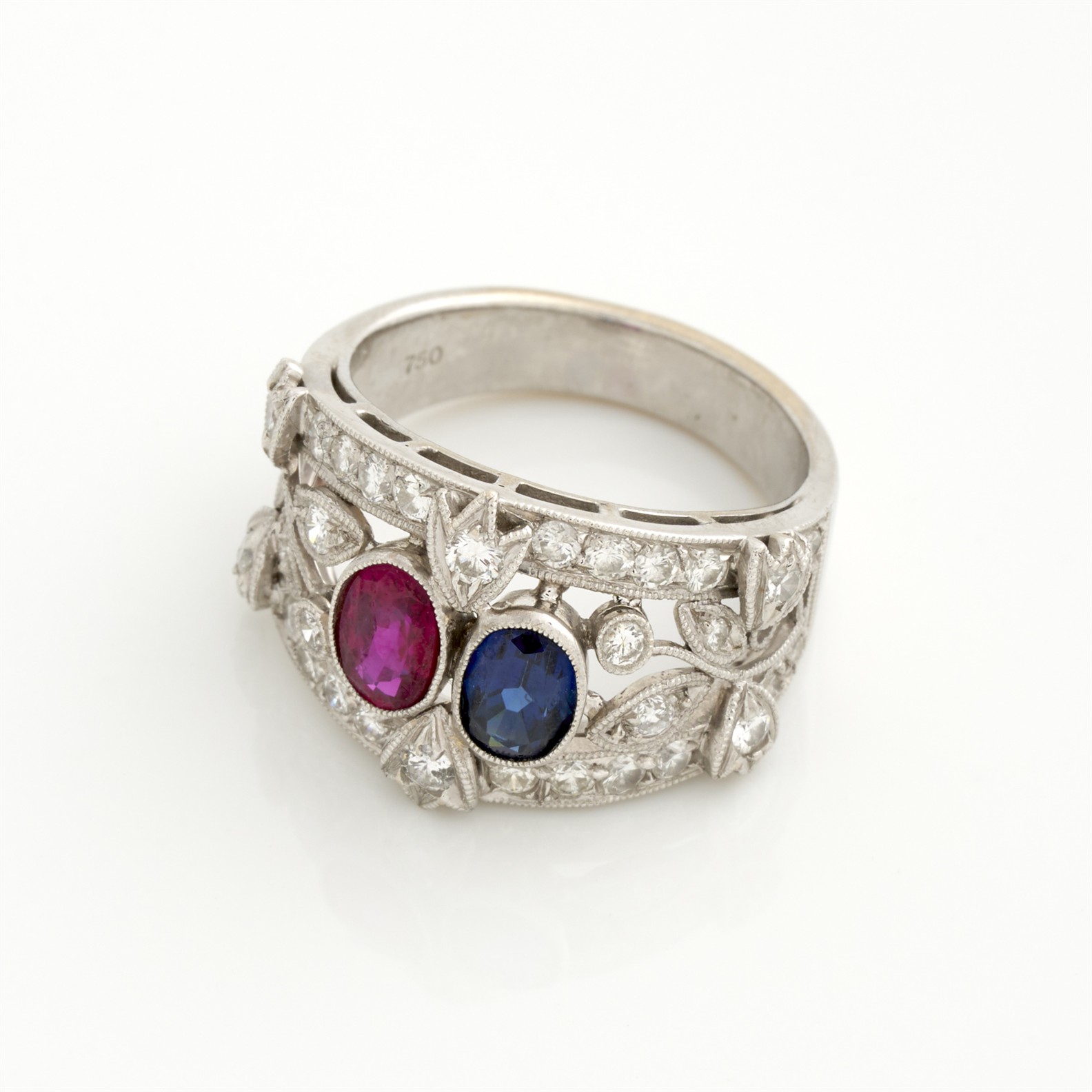 AN OPENWORK FOLIATE SAPPHIRE, RUBY AND DIAMOND RING IN 18CT WHITE GOLD, SIZE K 1/2, 7.0GMS