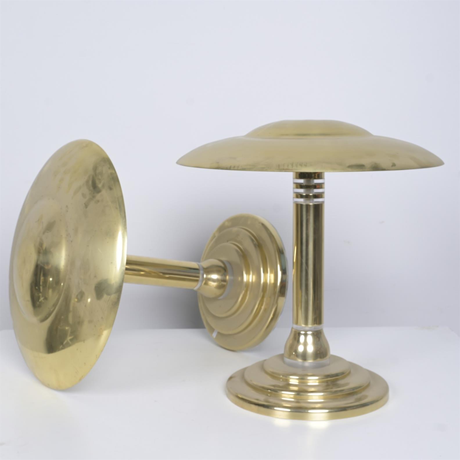 TWO BRASS AND PERSPEX TABLE LAMPS, ONE ALTERED TO FUNCTION AS A CEILING LIGHT - UNWIRED (A/F) (55H X 55D CM)