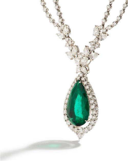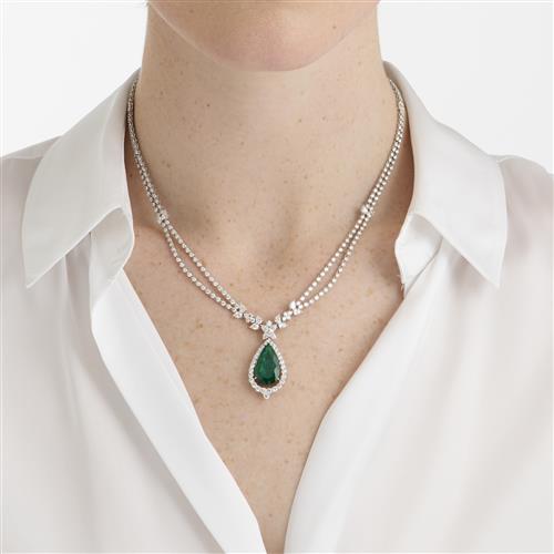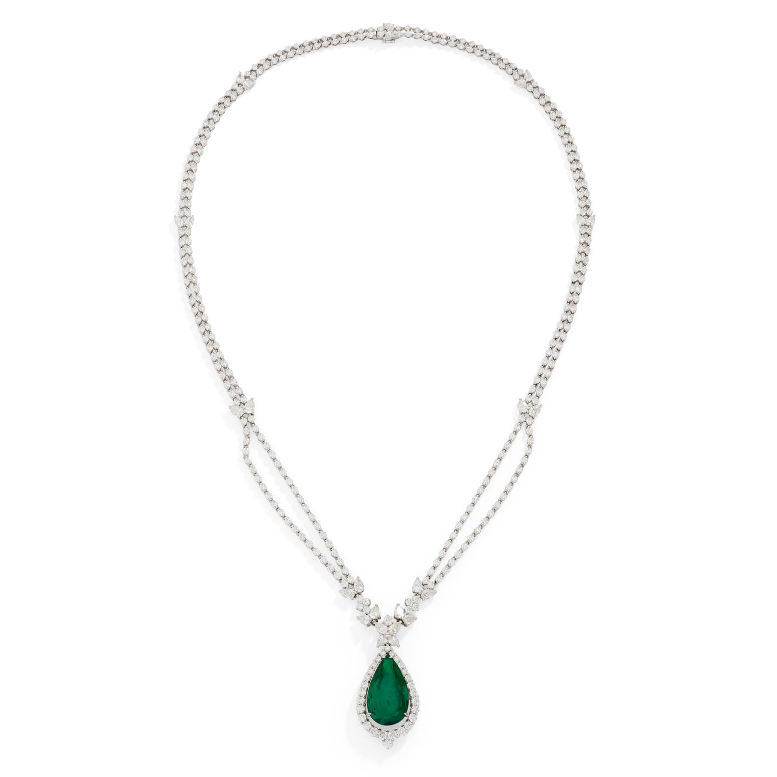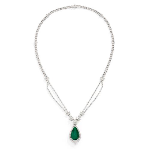 Terminating on a cluster swing-drop centring a claw-set pear-shaped emerald framed by a line of brilliant-cut and pear diamonds surmounted by a cluster of claw-set pear and brilliant-cut diamonds supported from a double row of claw-set brilliant-cut diamonds completed by a continuous line of collet-set diamonds to a concealed clasp, the emerald and diamonds together weighing approximately 4.05 carats and 7.23 carats respectively, mounted in 18ct white gold, gross weight approximately 27.4 grams, length 450mm, drop 40mm.
