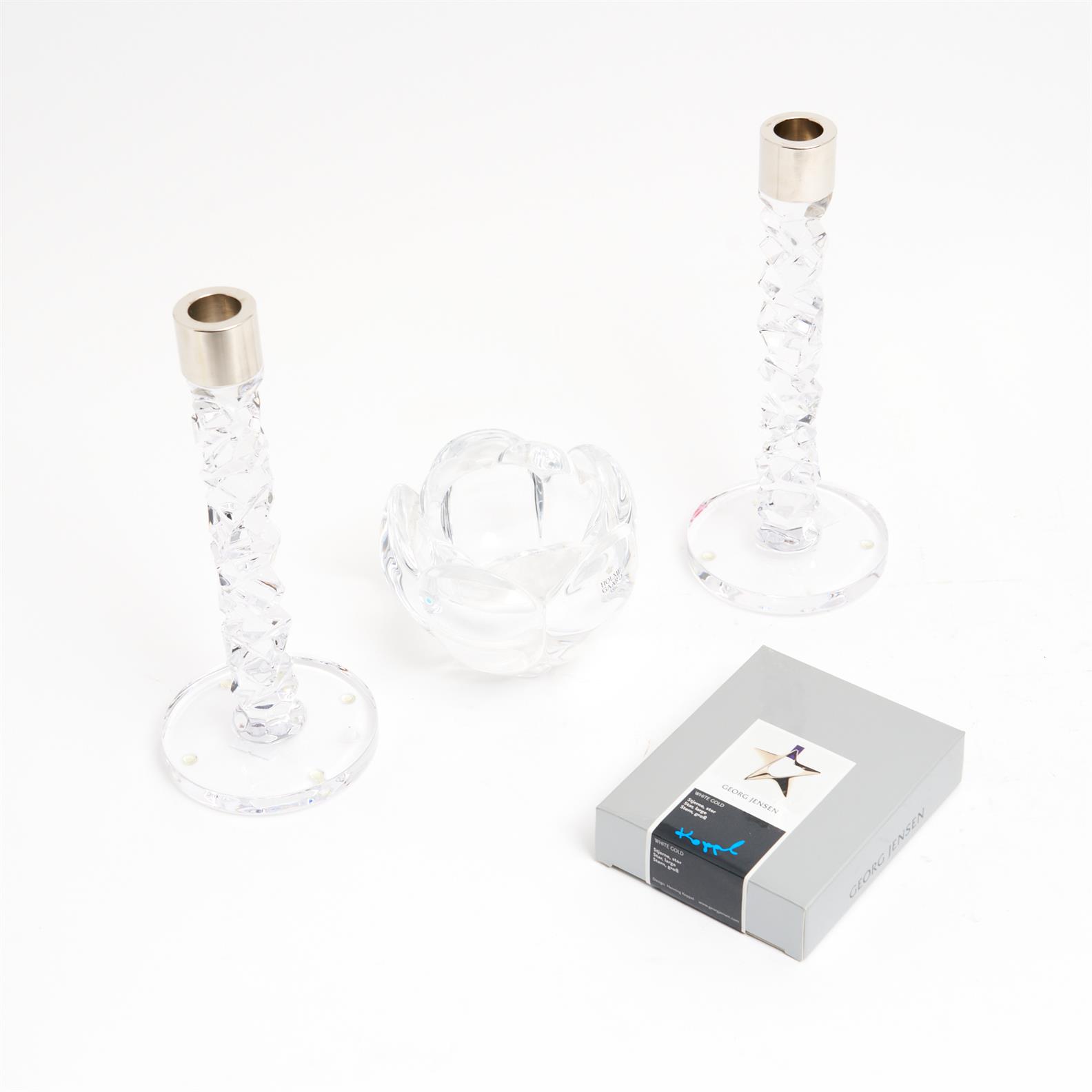 A COLLECTION OF SCANDINAVIAN GLASS INCLUDING A PAIR OF ORREFORS LENA BERGSTROM LJUSSTAKE CANDLESTICKS IN ORIGINAL BOX AND A HOLME GAARD VASE, TOGETHER WITH A GEORGE JENSEN STAR DECORATION IN ORIGINAL BOX H.15CM (TALLEST)