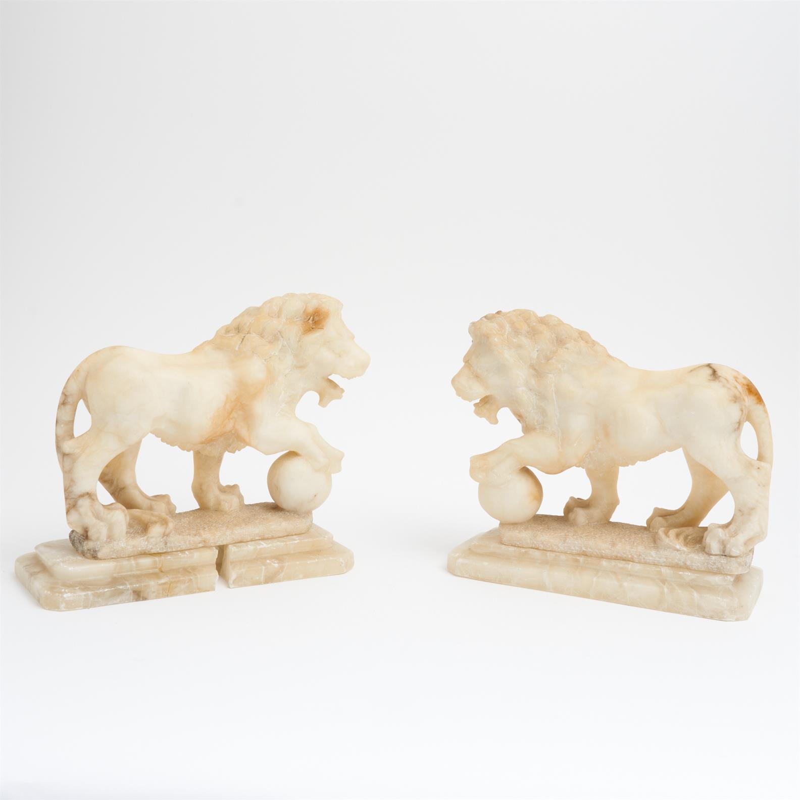 A MIRRORED PAIR OF CARVED ALABASTER MEDICI LIONS (MISSING LABELS) ON STANDS (ONE STAND BROKEN) H.25CM