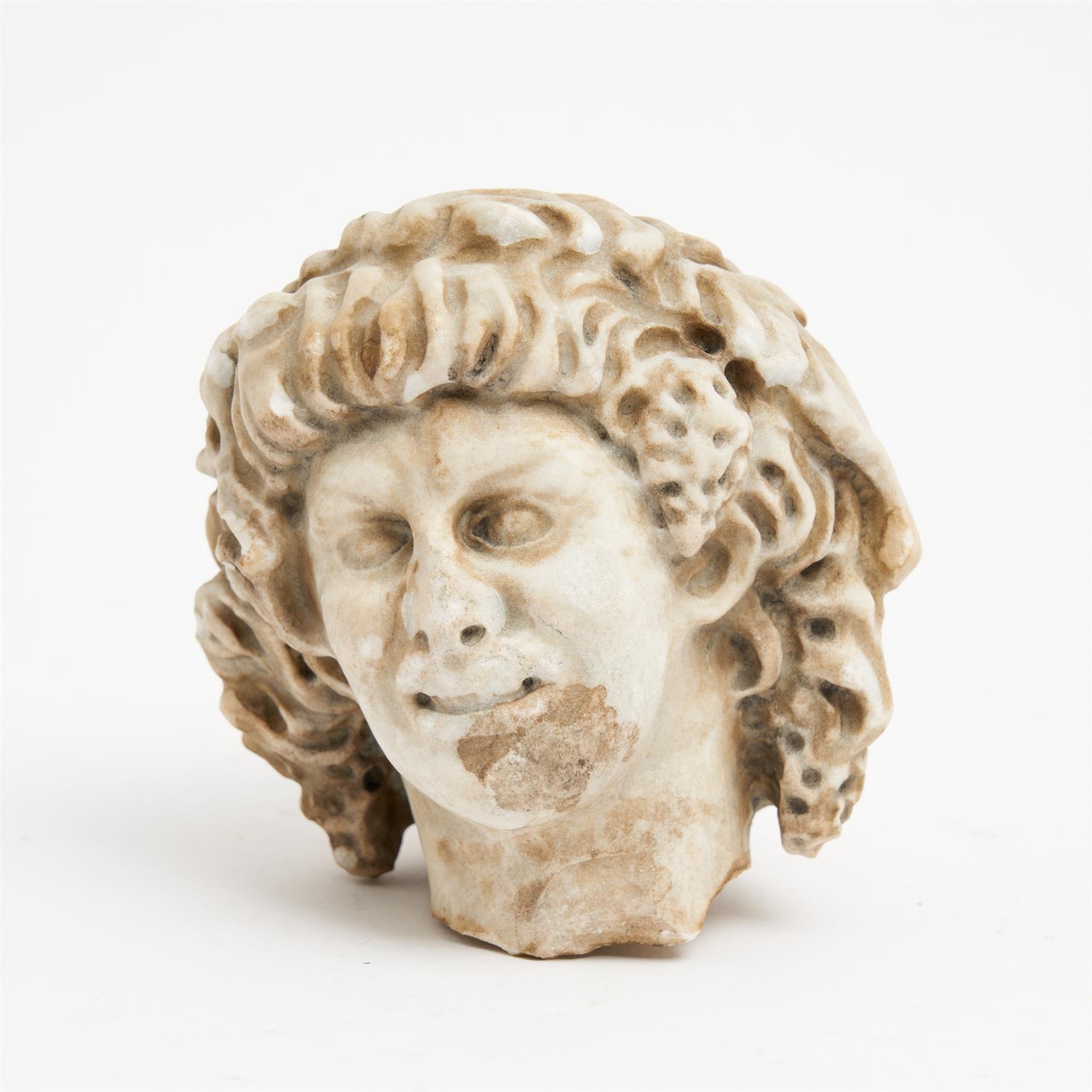 A CARVED MARBLE HEAD OF BACCHUS, AFTER THE ANTIQUE H.13CM