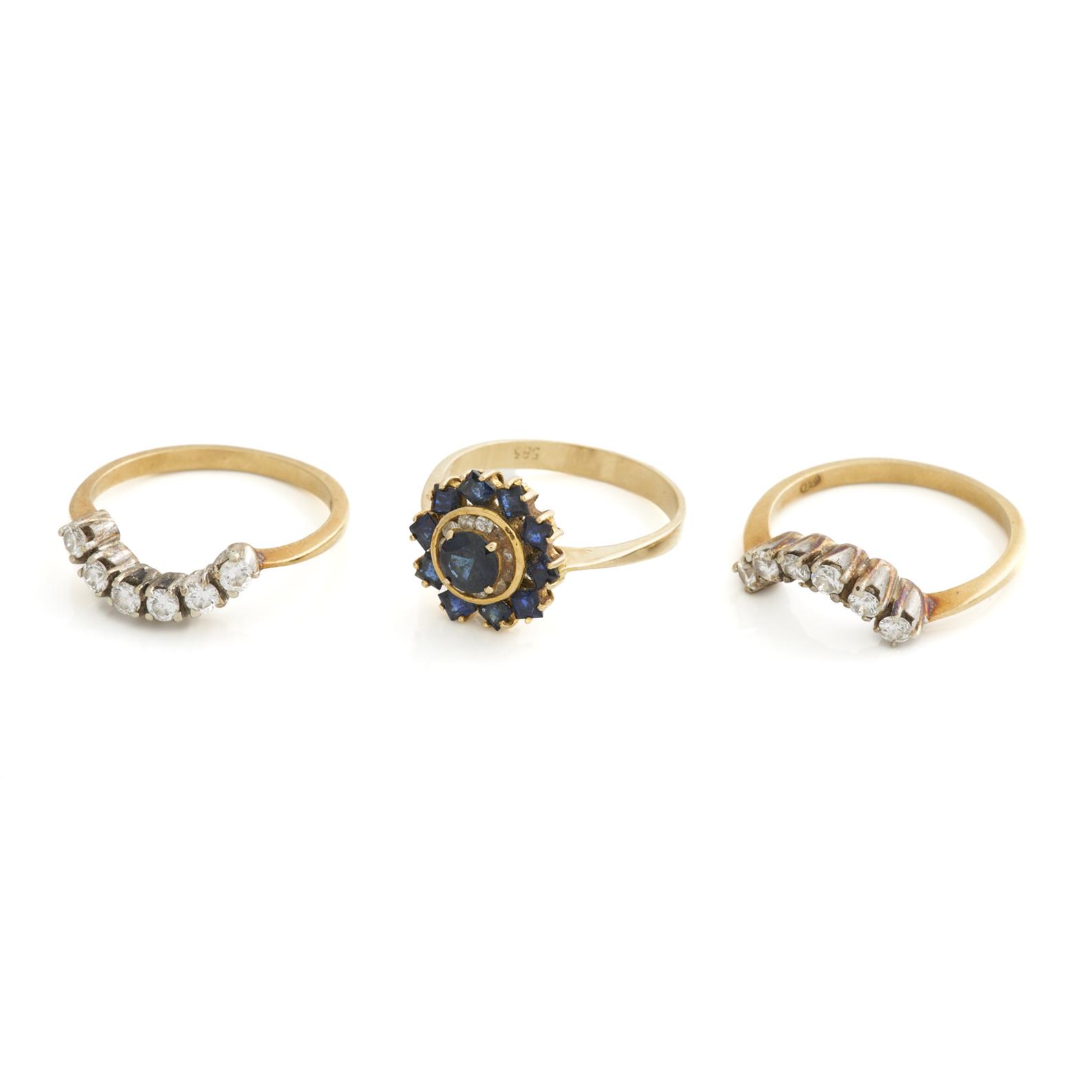 A SAPPHIRE AND GEM SET SUITE IN 18CT AND 14CT GOLD, SIZE O, TOTAL WEIGHT 7.8GMS