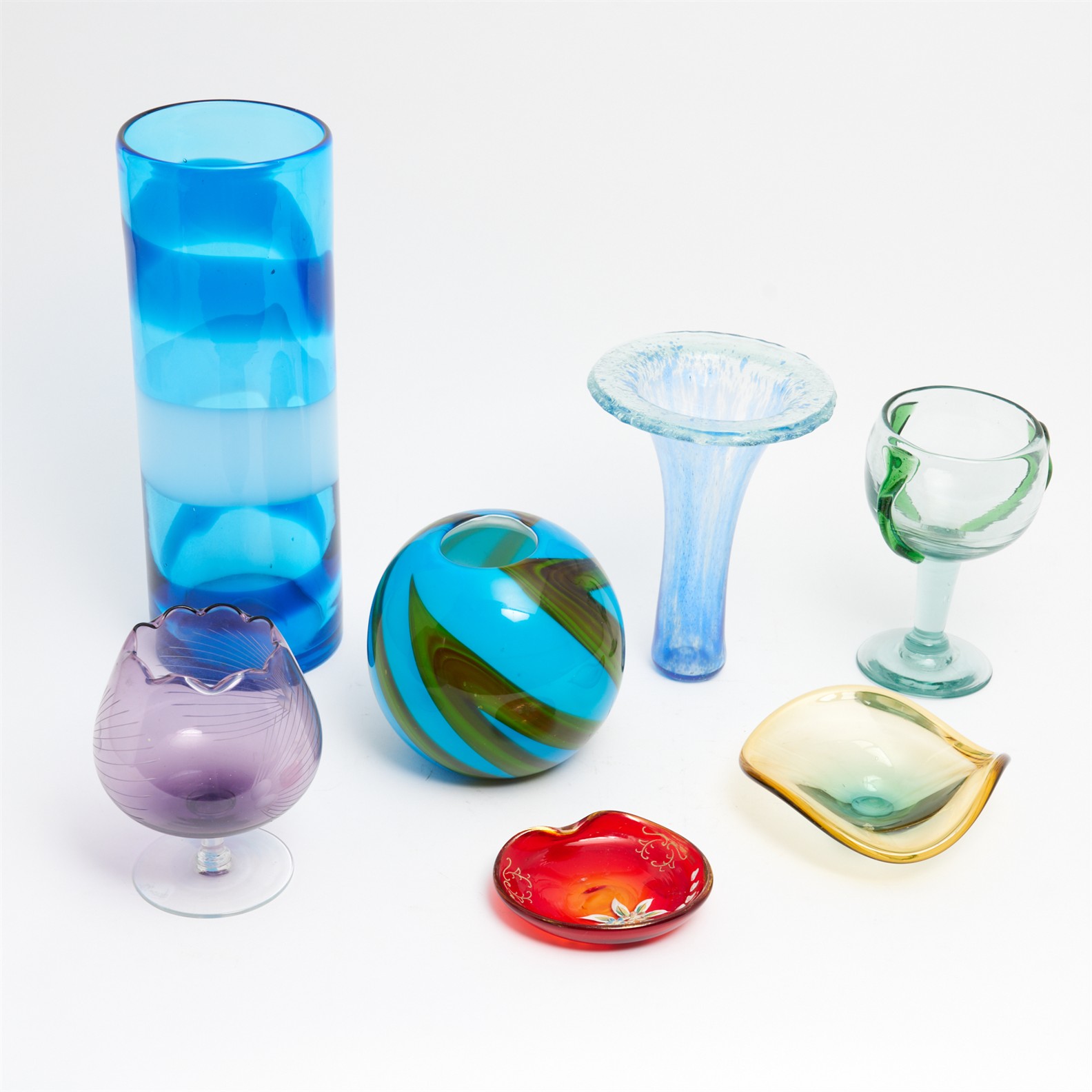 A GROUP OF MID-CENTURY AND LATER GLASS INLCUDING A LARGE CYLINDRICAL VASE, A MEXICAN GOBLET, AND OTHERS H35CM