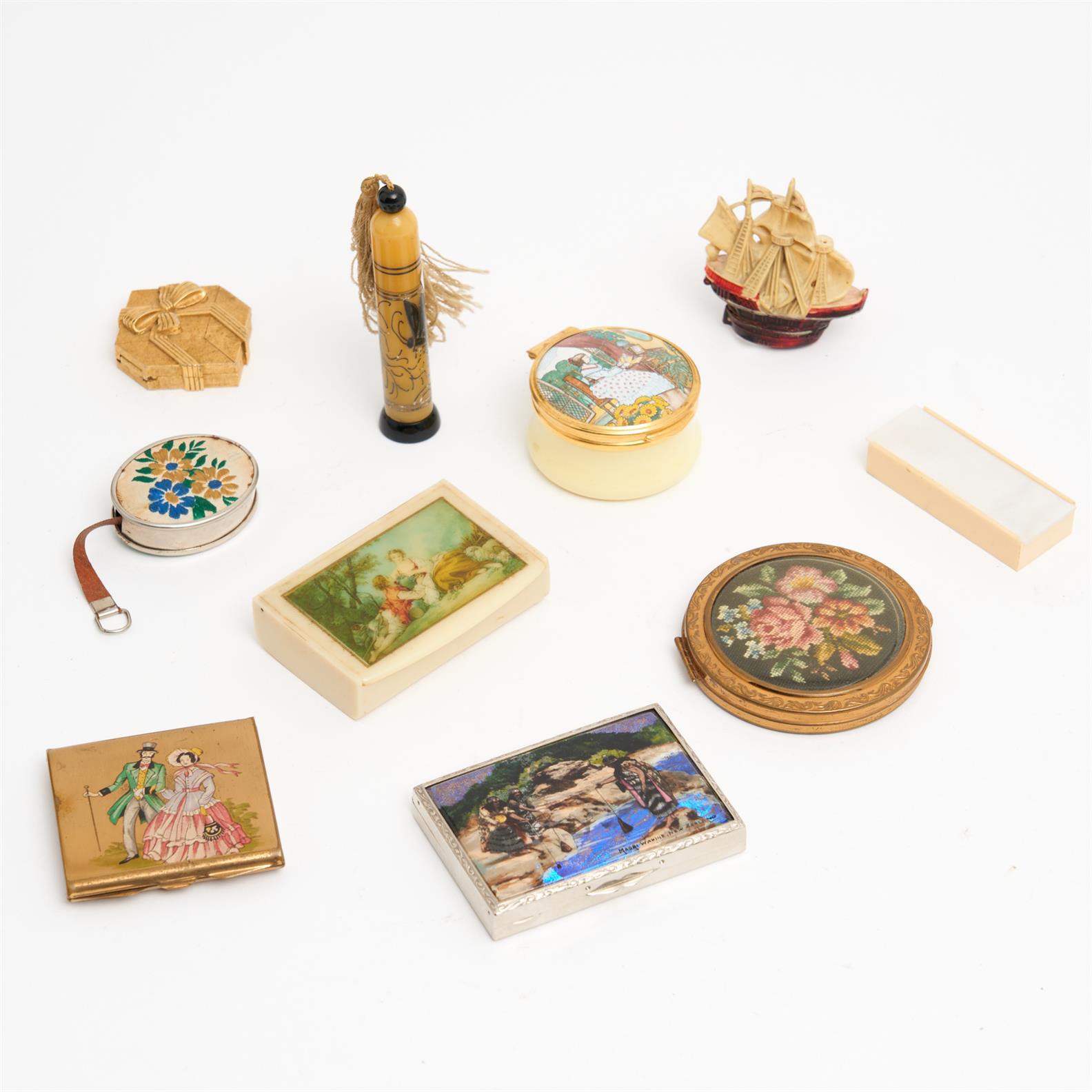 A COLLECITON OF VINTAGE BAKELITE, ENAMEL DECORATED AND METAL BOXES, COMPACTS AND ACCESSORIES INCLUDING TWO NOVELTY DRESSMAKERS MEASURING TAPES L.9.5CM (LARGEST)