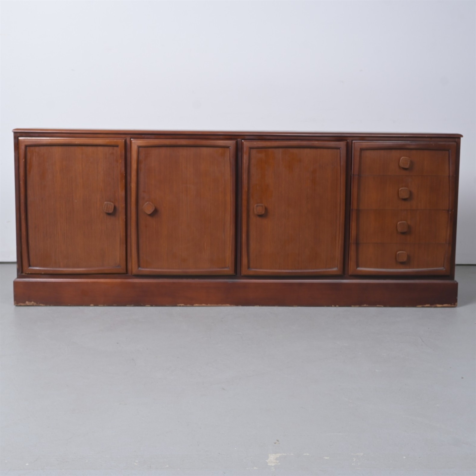 A 1970S TEAK SIDEBOARD (A/F) (74H X 188W X 48D CM) (THIS ITEM MUST BE REMOVED BY CARRIERS AT THE CUSTOMER'S EXPENSE. LEONARD JOEL STAFF CANNOT ASSIST CARRYING THIS ITEM)