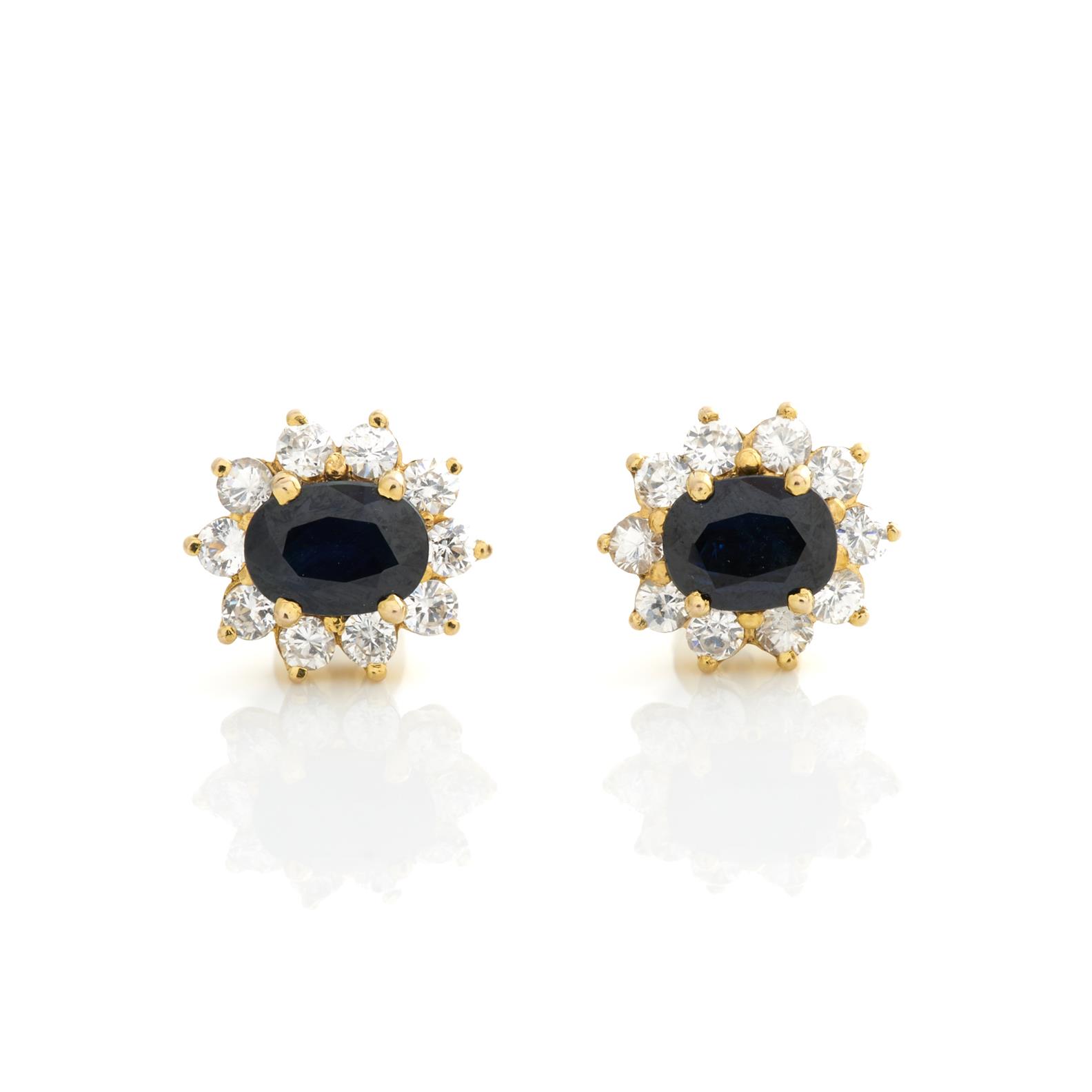 A PAIR OF SAPPHIRE AND GEM SET EARRINGS IN 14CT GOLD, TO POST AND BUTTERFLY FITTINGS, 10MM X 10MM, 3.4GMS