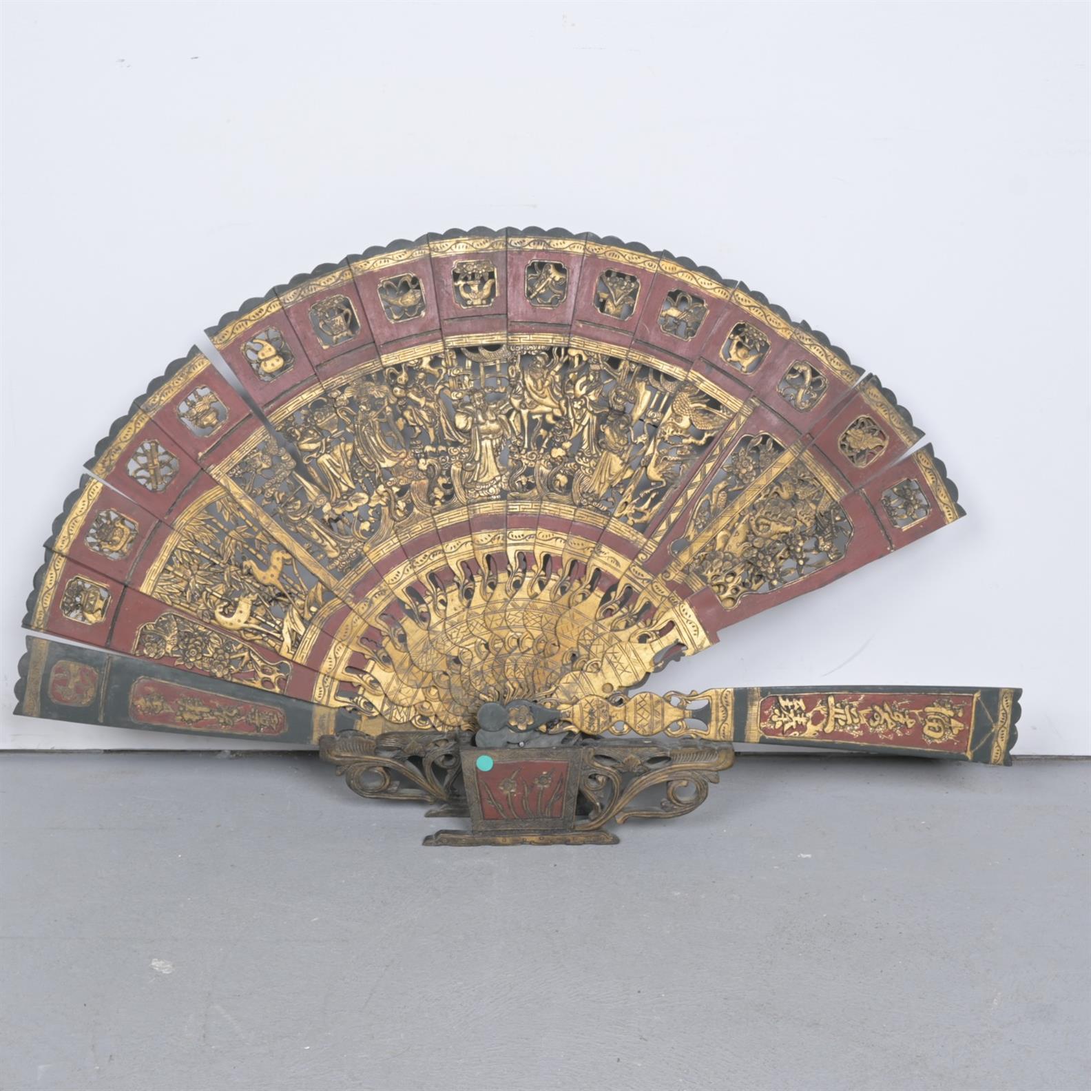 A CHINESE DECORATIVE CARVED PAINTED FAN (A/F) (73H X 116W CM)