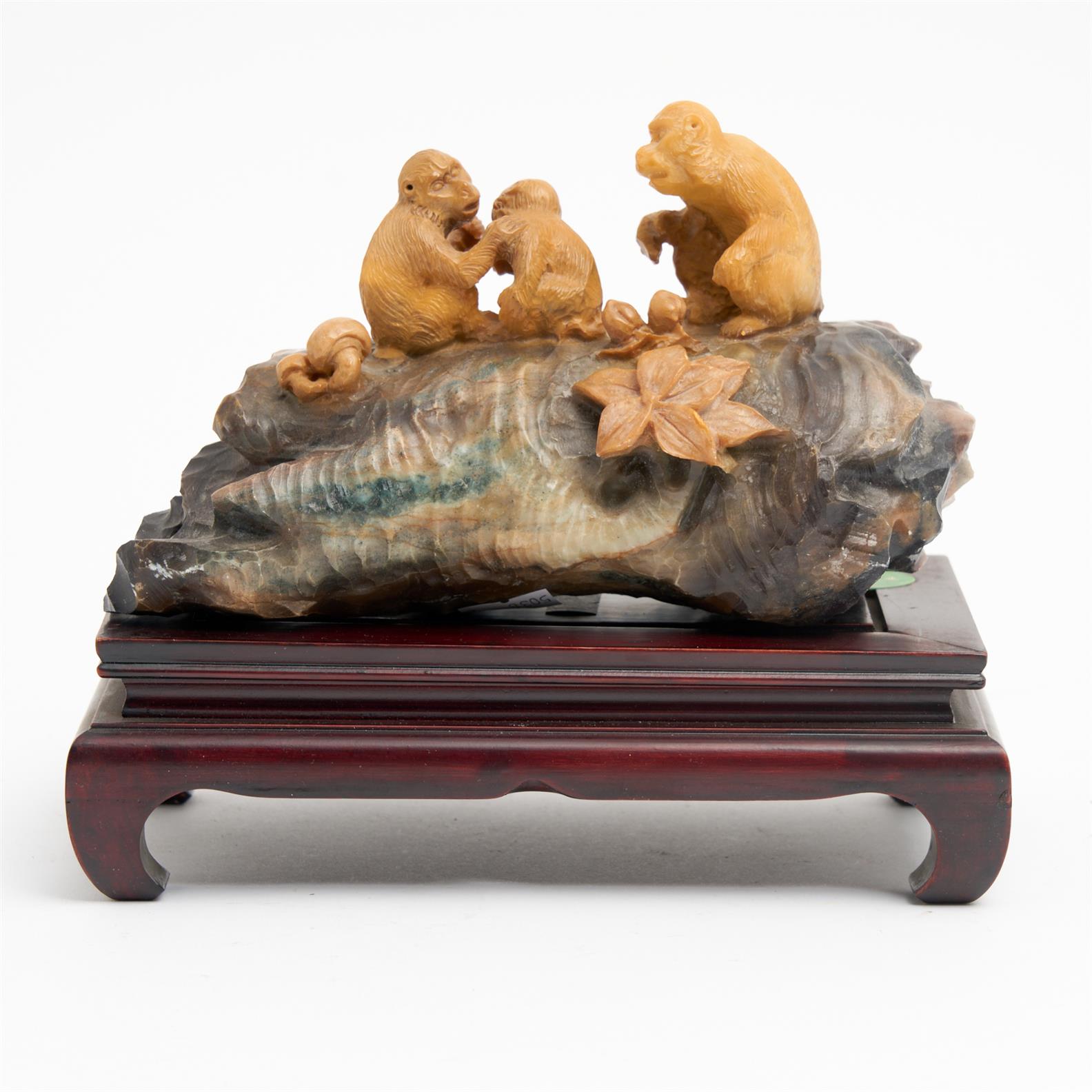 A MONKEY SOAPSTONE CARVING ON HARDWOOD STAND W.21CM