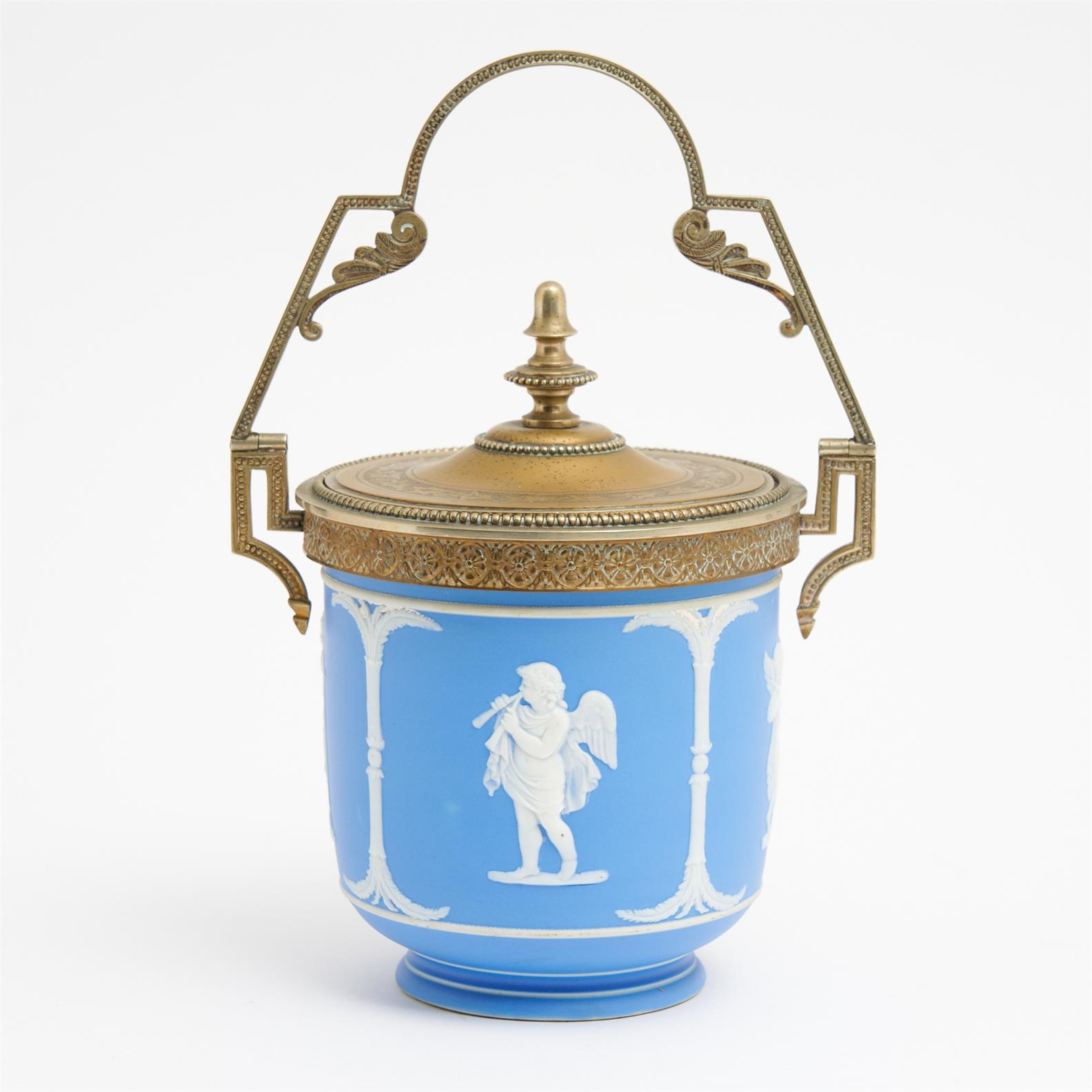 AN ANTIQUE WEDGWOOD JASPERWARE BISCUIT BARRELL H.19CM