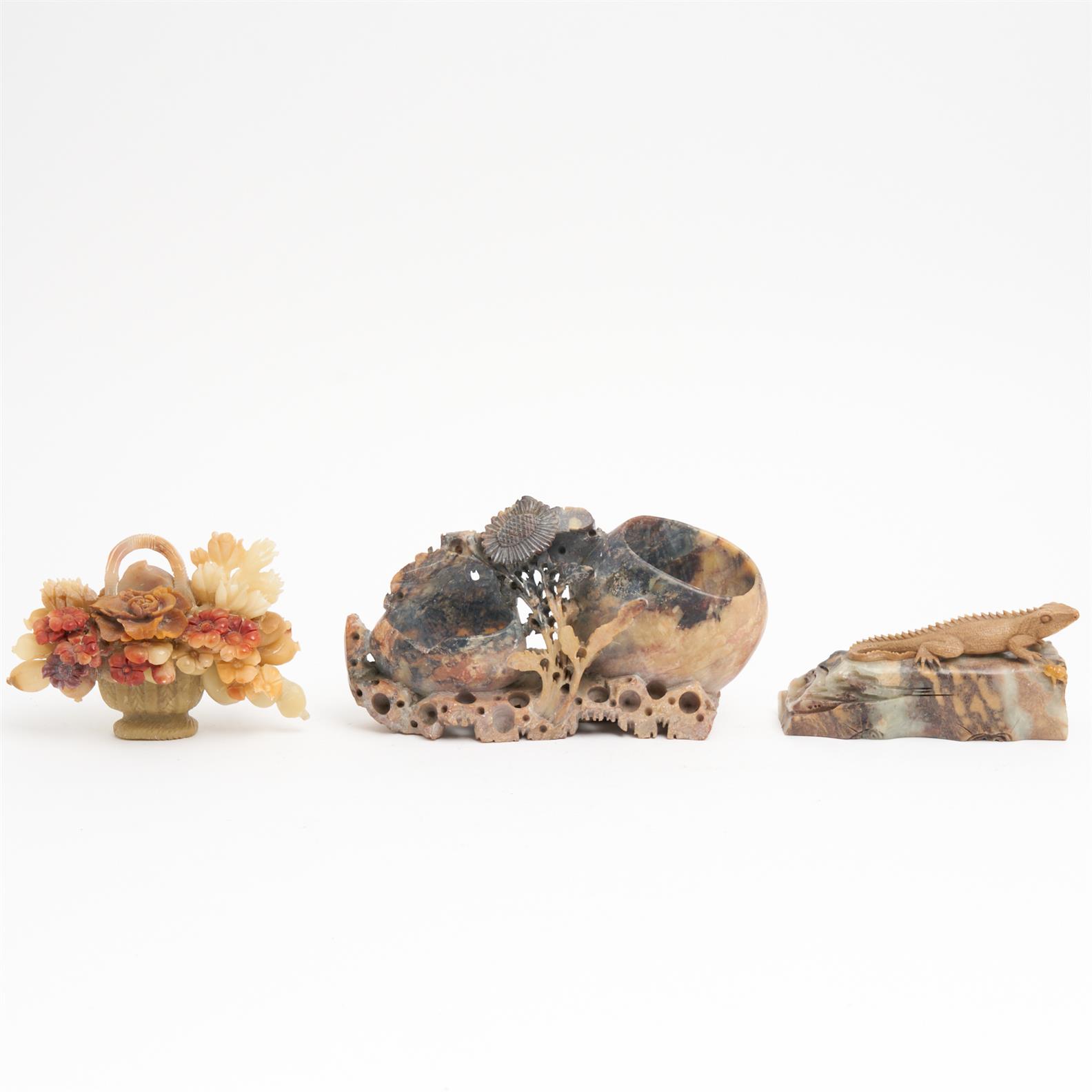 THREE SOAPSTONE CARVINGS INCLUDING A FLOWER GROUP, A SMALL LIZARD AND A SMALL VASE L.21.5CM (LARGEST)