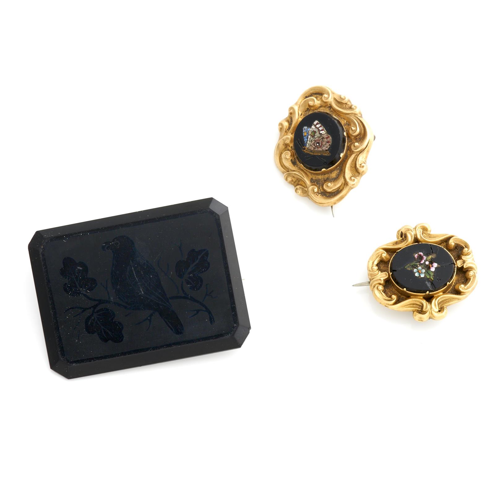 A COLLECTION OF THREE ANTIQUE MOURNING BROOCHES, TWO IN 9CT GOLD WITH ENCLOSED PANEL OF HAIR TO REVERSE, THE LARGEST BROOCH MEASURING 45MM X 35MM