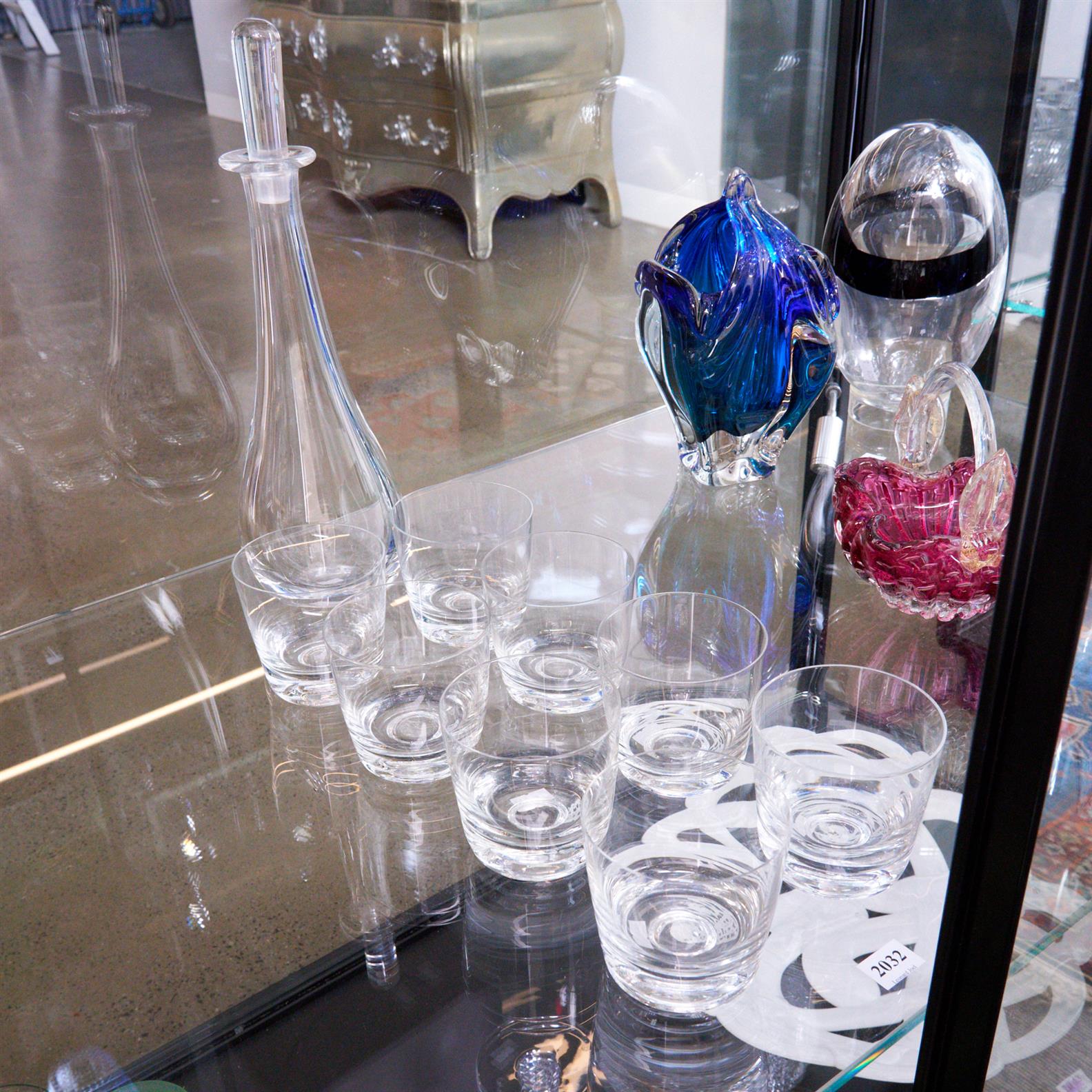 A SET OF 8 ORREFORS WHISKEY GLASSES BY NILS LANDBERG TOGETHER WITH A DECANTER BY VICKE LINDSTRAND, MADE IN SWEDEN H.34CM (TALLEST)