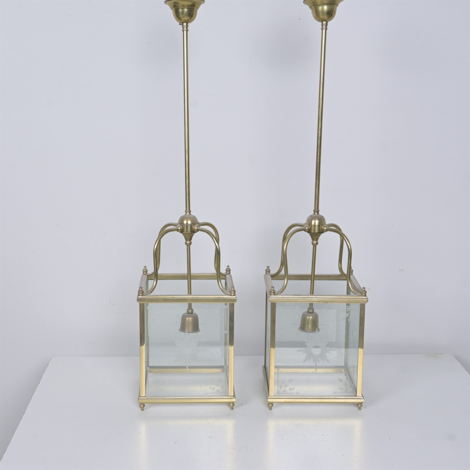 A PAIR OF BRASS AND ETCHED GLASS SQUARE PENDANT LIGHTS (A/F) (140H X 25D CM)
