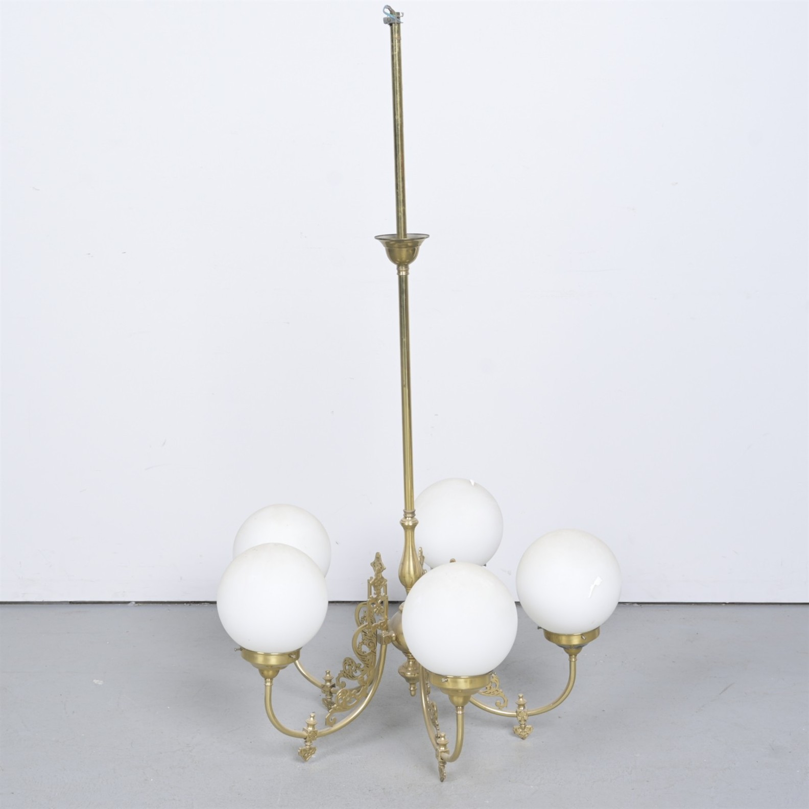 A BRASS FIVE LIGHT CHANDELIER WITH GLASS SHADES (135CM H X 70CM DIA)